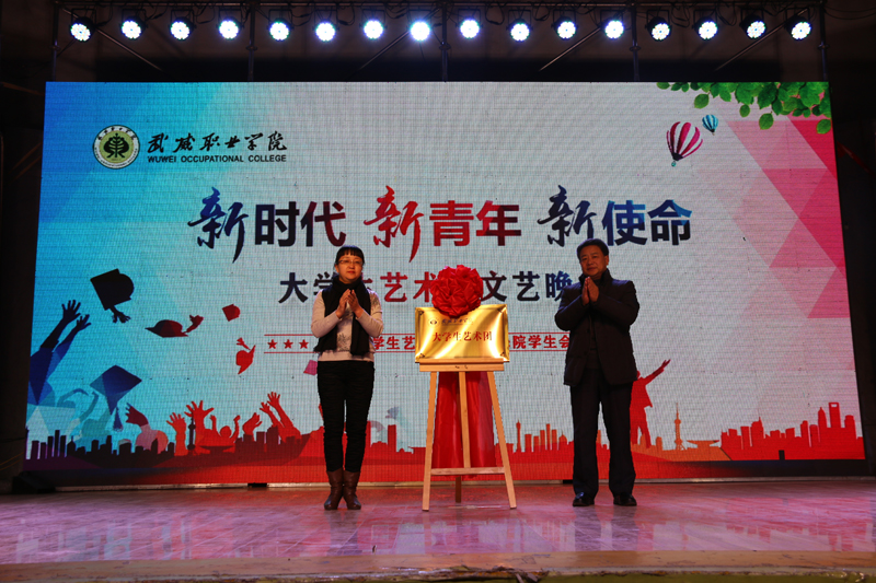 晚會(huì)開始前舉行了學(xué)院大學(xué)生藝術(shù)團(tuán)成立揭牌儀式,黨委副書記趙明、副院長(zhǎng)田迎春上臺(tái)為大學(xué)生藝術(shù)團(tuán)揭牌。