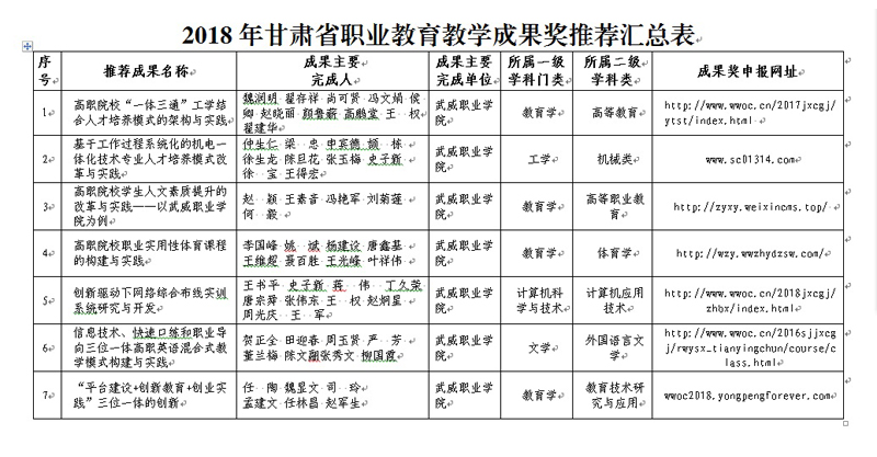 關(guān)于學(xué)院擬推薦2018年甘肅省職業(yè)教育教學(xué)成果獎(jiǎng)評選的公示