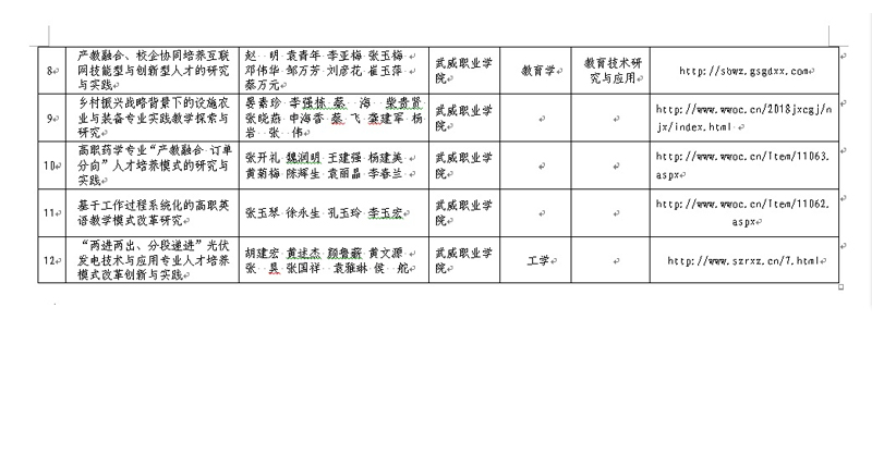 根據(jù)甘肅省人力資源和社會(huì)保障廳、甘肅省教育廳《關(guān)于開展2018年甘肅省職業(yè)教育教學(xué)成果獎(jiǎng)評選表彰工作的通知》精神,經(jīng)個(gè)人申報(bào),學(xué)院審核,決定擬推薦以下所提交紙質(zhì)材料、電子材料、申報(bào)網(wǎng)站等符合申報(bào)要求的12項(xiàng)教學(xué)成果參評2018年甘肅省職業(yè)教育教學(xué)成果獎(jiǎng),現(xiàn)予以公示。
