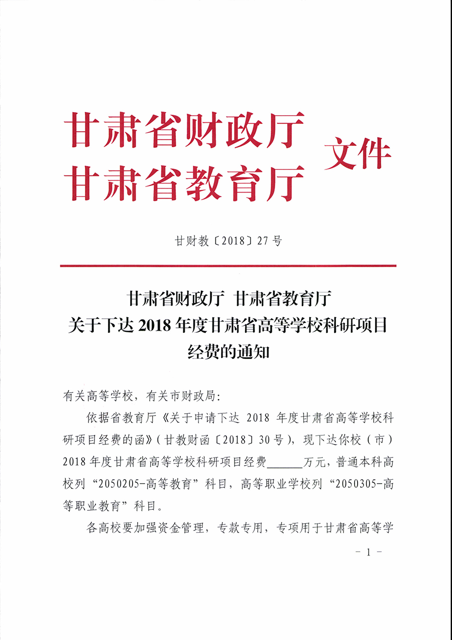 轉(zhuǎn)發(fā)甘肅省財政廳 甘肅省教育廳關(guān)于下達2018年度甘肅省高等學(xué)校科研項目經(jīng)費的通知