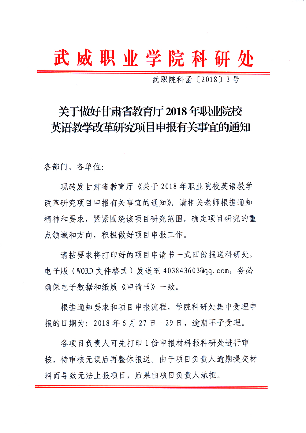 武職院科函〔2018〕3號(hào)——關(guān)于做好甘肅省教育廳2018年職業(yè)院校英語(yǔ)教學(xué)改革研究項(xiàng)目申報(bào)有關(guān)事宜的通知