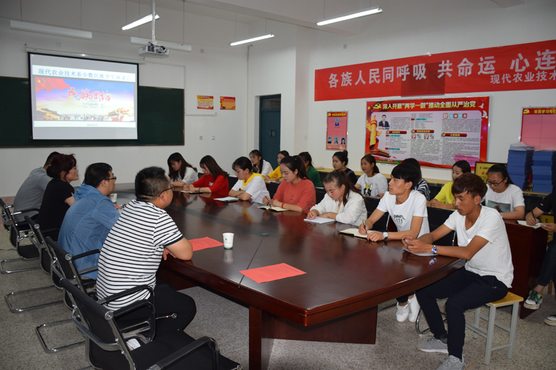 ???? 為認(rèn)真貫徹落實《學(xué)院第15個民族團結(jié)進(jìn)步宣傳月活動實施方案》,6月12日,現(xiàn)代農(nóng)業(yè)技術(shù)系在行樹樓教學(xué)區(qū)309會議室開展民族團結(jié)月系列活動。系黨總支書記晏素珍、龔建軍、蔡飛老師及全系少數(shù)民族學(xué)生參加會議,會議由系輔導(dǎo)員蔡海老師主持。