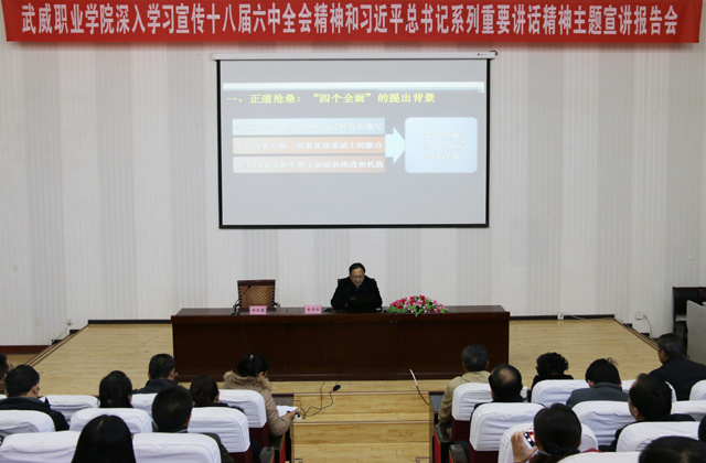 根據(jù)省委和全省宣傳工作會議關(guān)于在全省組織開展深入學(xué)習(xí)宣傳十八屆五中全會精神和習(xí)近平總書記系列重要講話精神主題宣講活動(dòng)的通知要求,為向全院黨員干部和師生宣傳好、解讀好十八屆五中、六中全會精神和習(xí)近平總書記系列重要講話的實(shí)質(zhì)內(nèi)涵和深遠(yuǎn)意義,將全會精神和總書記系列重要講話精神作為指導(dǎo)和推動(dòng)學(xué)院各項(xiàng)事業(yè)快速發(fā)展的科學(xué)理論和強(qiáng)大動(dòng)力。10月29日上午,“武威職業(yè)學(xué)院深入學(xué)習(xí)宣傳十八屆五中、六中全會精神和習(xí)近平總書記系列重要講話精神主題宣講報(bào)告會”在學(xué)院尚德樓正德廳舉行。會議邀請省委講師團(tuán)成員、蘭州大學(xué)馬克思主義學(xué)院博士生導(dǎo)師王學(xué)儉教授蒞臨學(xué)院,作題為“四個(gè)全面”戰(zhàn)略布局解讀的宣講報(bào)告。學(xué)院黨委副書記趙明,副院長王永緒、潘玉華、田迎春,全體中層干部,各部門師生代表共計(jì)260余人參加宣講報(bào)告會。報(bào)告會由田迎春主持。