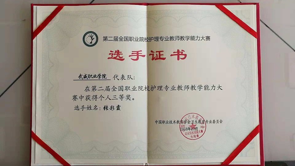 競賽共分為理論考核、說課程和臨床護(hù)理技能操作三個(gè)部分。其中,臨床護(hù)理技能操作部又分為三項(xiàng),心肺復(fù)蘇術(shù)和靜脈輸液操作技術(shù)為必選項(xiàng)目,置胃管技術(shù)和氣管切開護(hù)理技術(shù)為抽選項(xiàng)目。經(jīng)過三天緊張激烈的比拼,通過了全部考核內(nèi)容的綜合評(píng)定,最終張彩霞老師獲得了三等獎(jiǎng)。