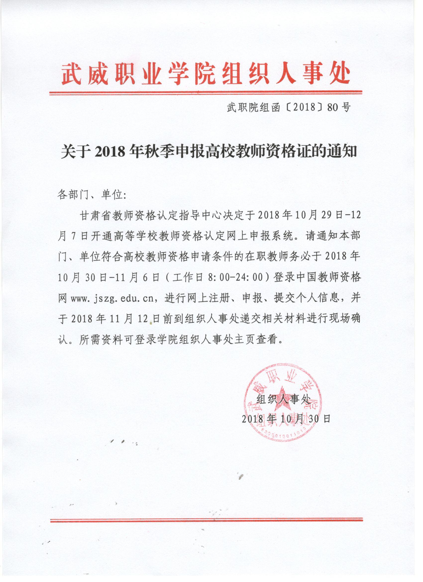 關(guān)于2018年秋季申報高校教師資格證的通知