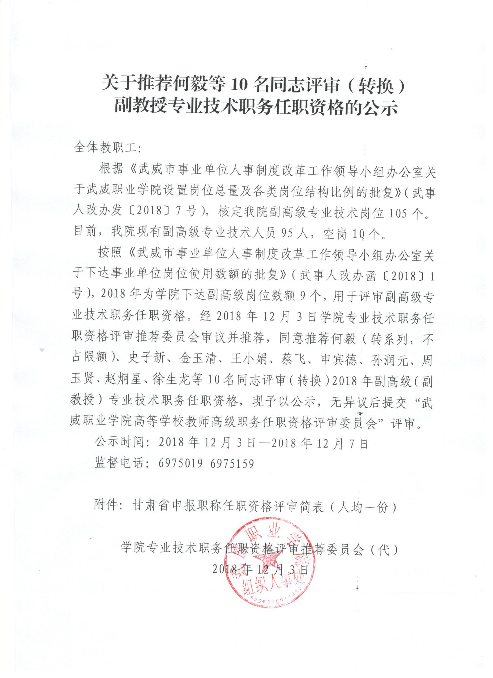 關于推薦何毅等10名同志評審(轉換)副教授專業(yè)技術職務任職資格的公示