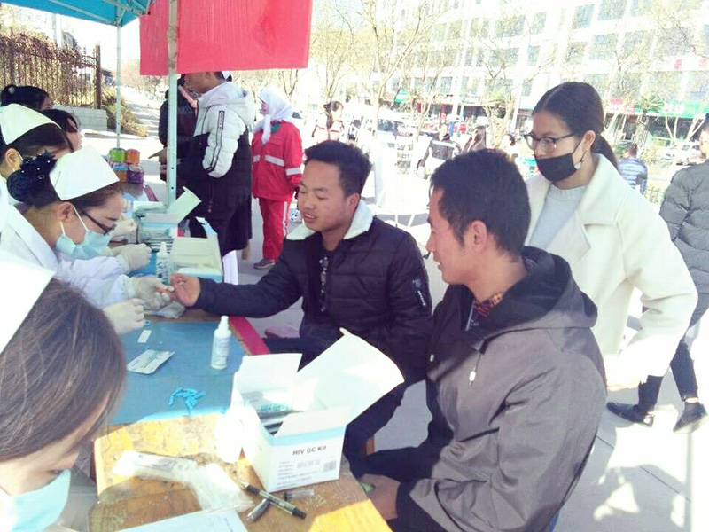 11月17日開始利用周末時間在武威文化廣場、武威職業(yè)學(xué)院門口等地開展了免費檢測艾滋病與知艾防艾知識宣傳活動?;顒游藦V大師生及路人,組織井然有序,活動場面顯得忙而不亂。在護理系紅絲帶協(xié)會志愿者與武威市疾控中心人員嫻熟的操作下,通過指尖采血,HIV病毒膠體金法檢測,共檢測了80余人,檢測速度快,精準(zhǔn)度高。檢測結(jié)束后,向檢測者贈送活動宣傳紀(jì)念品。此次檢測活動采取保密制,保護檢測者的一切信息。