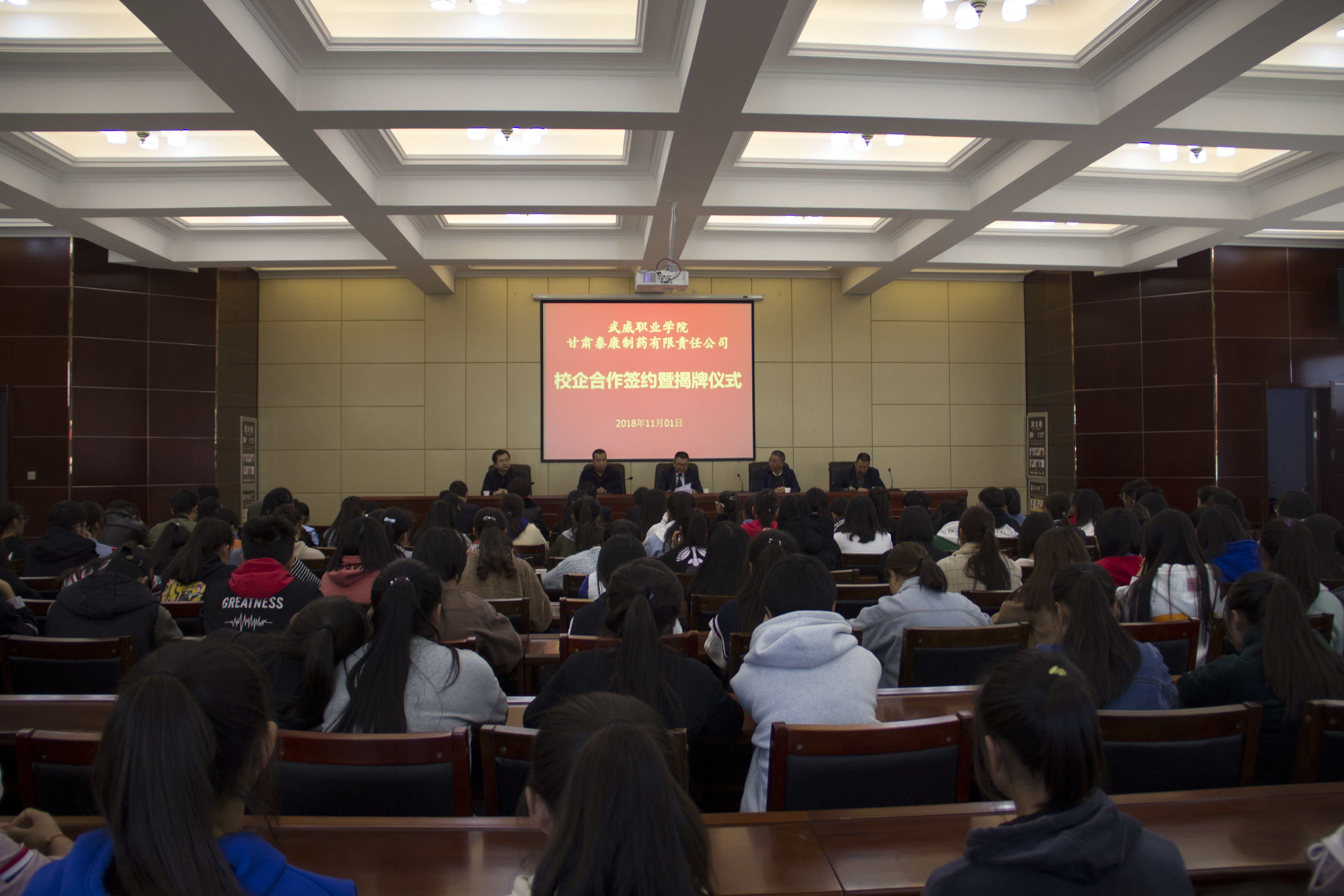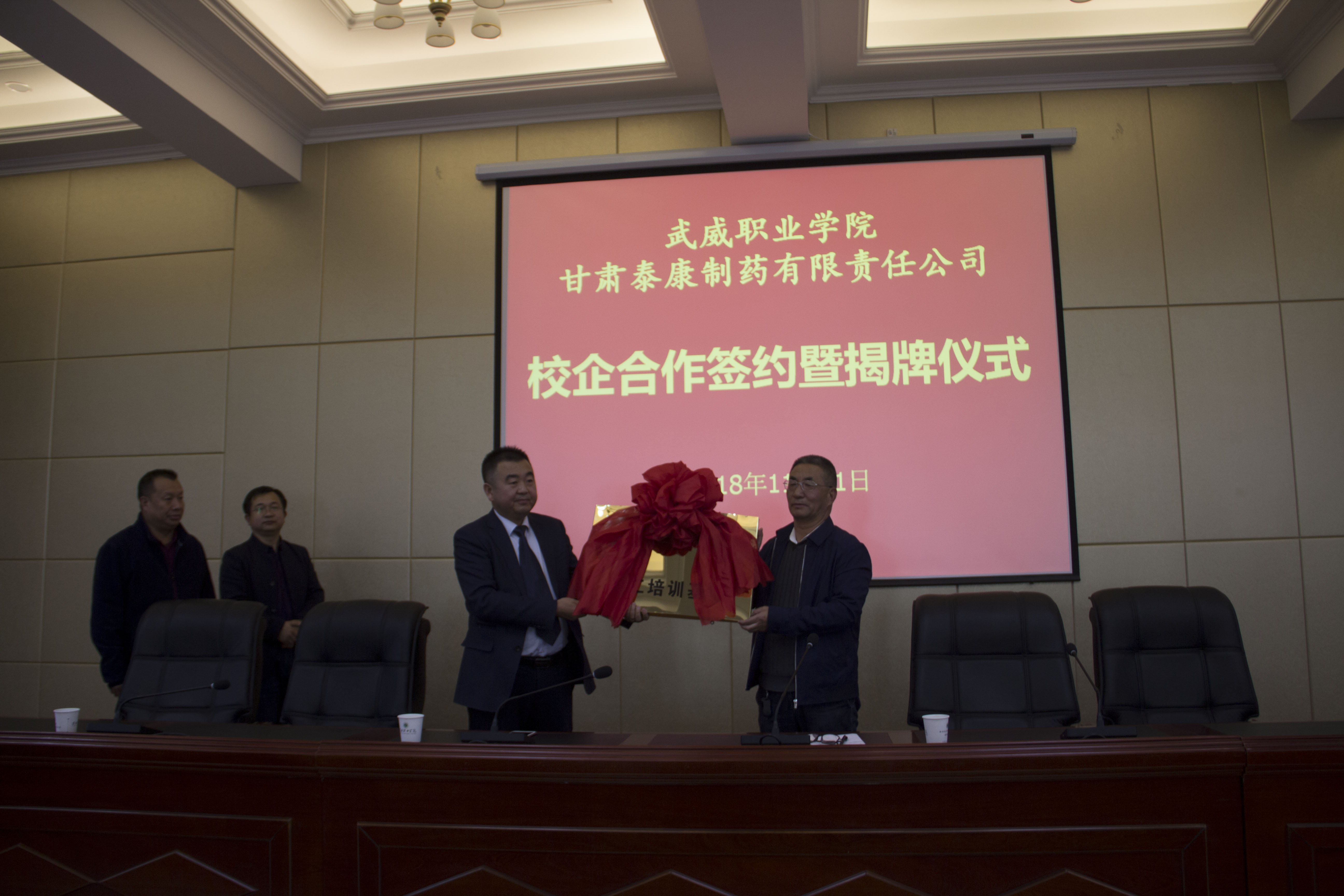 為提高人才培養(yǎng)質(zhì)量和辦學(xué)水平,加強(qiáng)校企協(xié)同育人機(jī)制建設(shè),11月1日下午,藥學(xué)系與甘肅泰康制藥有限責(zé)任公司校企合作共建“就業(yè)實習(xí)基地”簽約揭牌儀式在行樹樓北側(cè)會議室隆重舉行。甘肅泰康制藥有限責(zé)任公司投資方—北京久朝集團(tuán)產(chǎn)業(yè)中心總監(jiān)楊宏超、公司總工程師毛著鴻、財務(wù)總監(jiān)郝敏等企業(yè)領(lǐng)導(dǎo)出席本次儀式。學(xué)院教務(wù)處處長仲生仁、招生就業(yè)處處長蔡柱山、藥學(xué)系主任魏潤明、副主任楊建美、黨總支副書記單光年及藥學(xué)系160余名師生參加了此次簽約揭牌儀式。儀式由魏潤明主持。