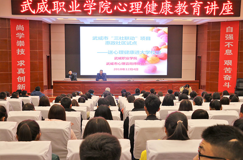 12月4日晚上,學(xué)生工作處聯(lián)合武威市“三社聯(lián)動(dòng)”惠政社區(qū)試點(diǎn)項(xiàng)目在學(xué)院菁英廳舉辦了心理健康專題講座暨心理信息員培訓(xùn)。此次講座邀請(qǐng)武威市心理咨詢師協(xié)會(huì)會(huì)長(zhǎng)何飛老師主講,學(xué)院各系輔導(dǎo)員、2017級(jí)、2018級(jí)班級(jí)心理信息員、心翼心理社團(tuán)會(huì)員等220多人聆聽了講座。學(xué)生工作處處長(zhǎng)王守云主持活動(dòng)。