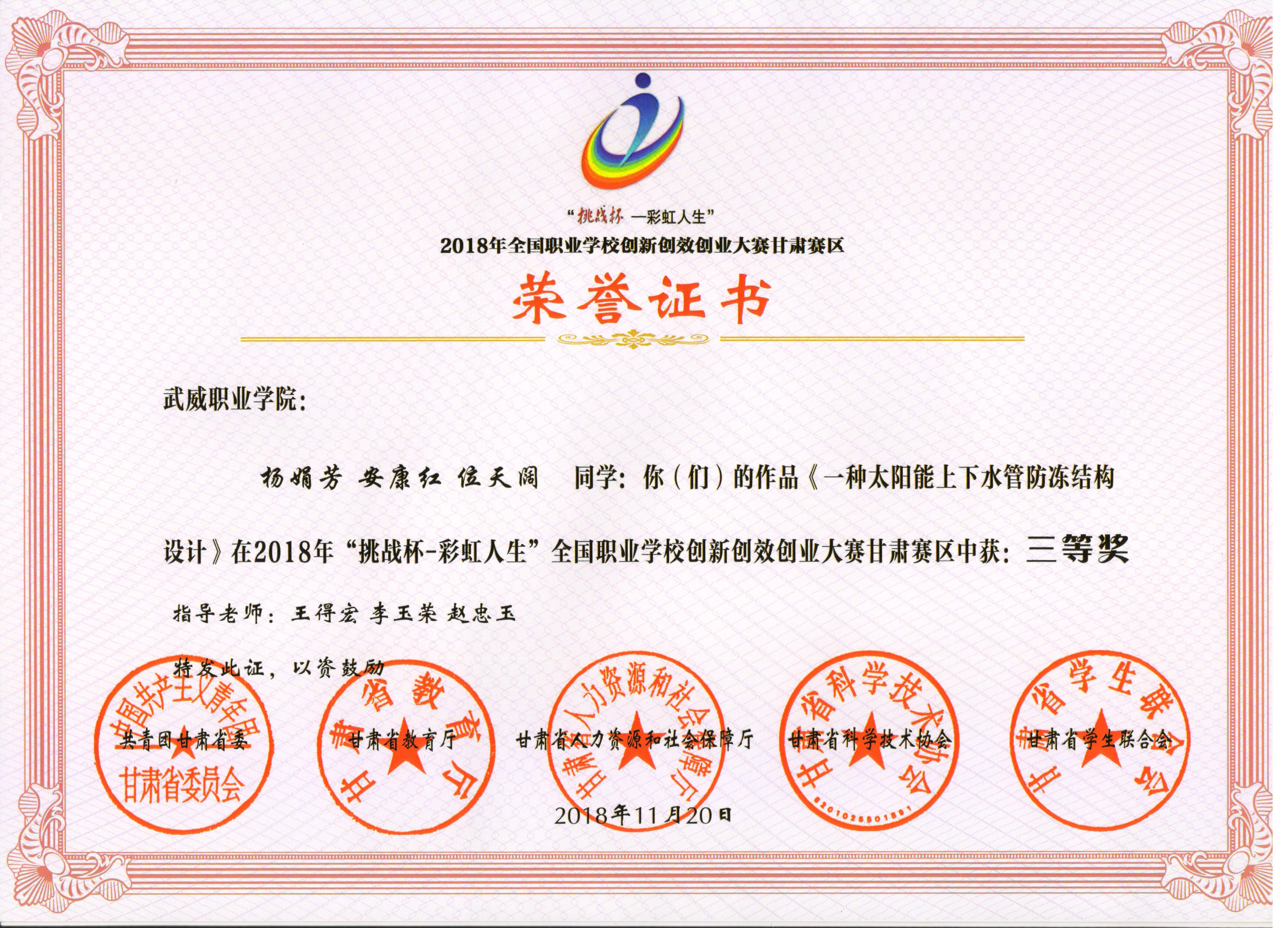 2018年“挑戰(zhàn)杯--彩虹人生”全國職業(yè)學校創(chuàng)新創(chuàng)效創(chuàng)業(yè)大賽甘肅賽區(qū)三等獎