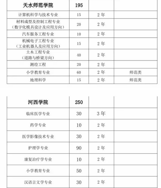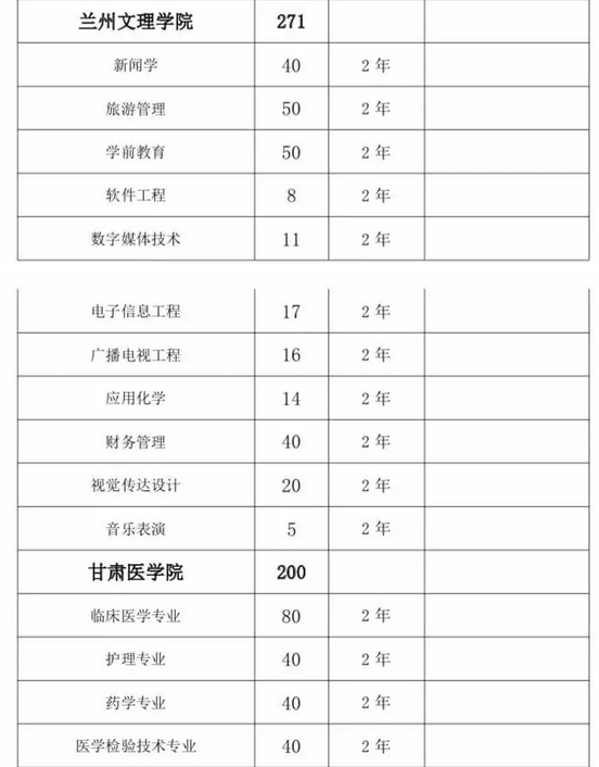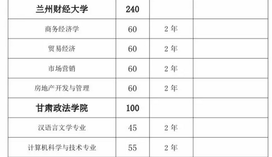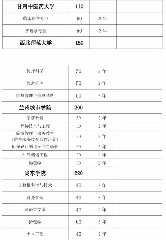 甘肅省2019年普通高校“專升本”招生計劃匯總表