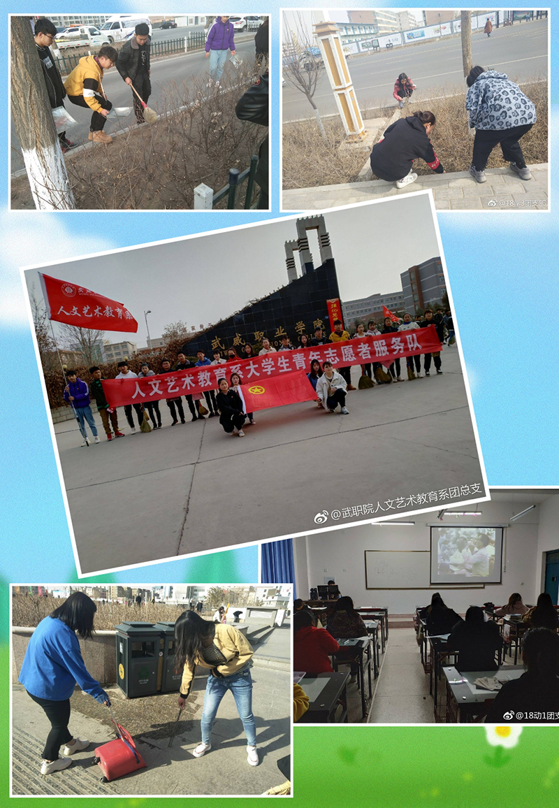 活動開始階段,我系組織各班觀看《向雷鋒同志學(xué)習(xí)》的紀(jì)錄片,同時開展“環(huán)境保護(hù)從我做起”校園服務(wù)活動,3月9日由系輔導(dǎo)員齊斌文老師帶領(lǐng)志愿者們到武威市文化廣場開展清潔志愿活動;3月17日由唐鑫基老師帶隊前往涼州區(qū)高壩敬老院開展志愿服務(wù)活動;3月29日由馮燕老師帶隊前往雷臺公園開展志愿服務(wù)。