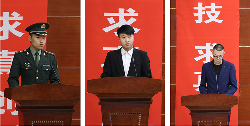 在啟動儀式上,現(xiàn)役軍人代表31666部隊防化營防化二連排長唐功財、學院退役大學生代表李乾和入伍意愿大學生代表李宏飛進行了發(fā)言,講出了各自的感想和感受。