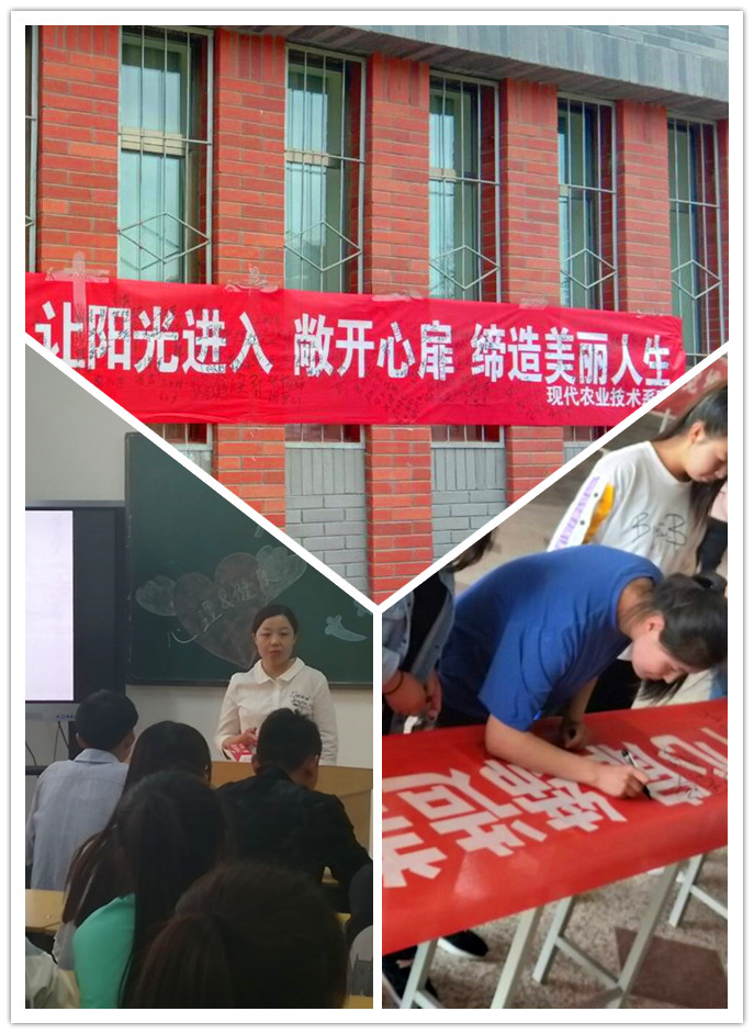 邀請(qǐng)現(xiàn)代農(nóng)業(yè)技術(shù)系張曉燕老師做了題為《預(yù)見未知的自己》的講座;系團(tuán)學(xué)會(huì)組織學(xué)生參加“打開心靈的窗戶,讓陽光進(jìn)入;敞開心扉,締造美麗人生。”主題簽名活動(dòng)。各班召開心理健康主題班會(huì)、開展心理游戲和手抄報(bào)活動(dòng)。