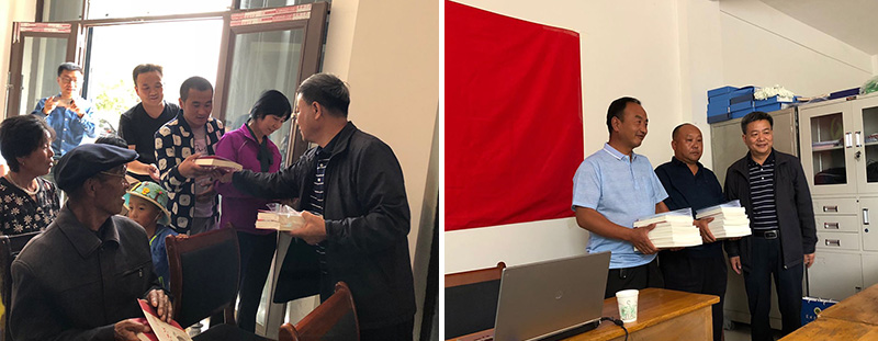課后,學(xué)院領(lǐng)導(dǎo)把《習(xí)近平新時(shí)代中國特色社會主義思想學(xué)習(xí)綱要》《習(xí)近平新時(shí)代中國特色社會主義思想三十講》《全國優(yōu)秀共產(chǎn)黨員風(fēng)采錄》《新時(shí)代黨支部規(guī)范化建設(shè)工作實(shí)用手冊》和“掃黑除惡”知識手冊等14類50多冊黨建書籍分別贈送給蘆草溝村、尚家臺村黨支部和駐村工作隊(duì),還向聽課的村民黨員贈送《習(xí)近平的七年知青歲月》等書籍。進(jìn)村入戶的幫扶干部向幫扶戶村民黨員贈送了黨建書籍。共贈送100多冊價(jià)值2700多元黨建書籍和掃黑除惡手冊。
