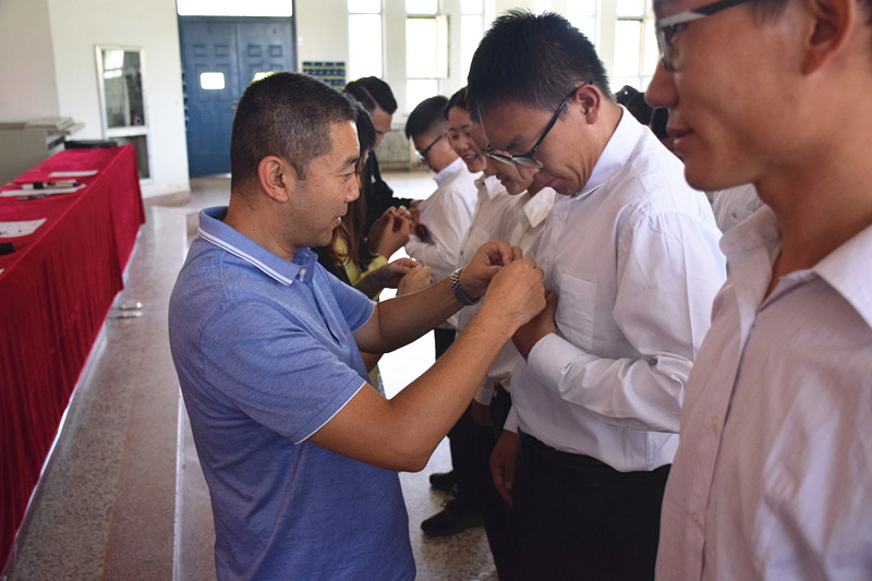 羅小勇為新黨員佩戴黨徽,并代表學(xué)院黨委對(duì)新入黨的56名預(yù)備黨員表示熱烈的祝賀和歡迎。他強(qiáng)調(diào),作為預(yù)備黨員,一要恪守入黨誓詞,踐行莊嚴(yán)承諾,堅(jiān)定不移地從思想和行動(dòng)上與黨組織保持高度一致,牢固樹立“四個(gè)意識(shí)”,增強(qiáng)“四個(gè)自信”,堅(jiān)決做到“兩個(gè)維護(hù)”,激發(fā)奮發(fā)向上的學(xué)習(xí)、生活和工作熱情,努力營(yíng)造踏實(shí)務(wù)實(shí)的學(xué)習(xí)氛圍;二要充分發(fā)揮先鋒模范作用,在各自的學(xué)習(xí)生活中體現(xiàn)黨的先進(jìn)性,成為同學(xué)中的旗幟標(biāo)桿力量;三要牢記全心全意為人民服務(wù)的宗旨,努力實(shí)踐,立志成為中國(guó)特色社會(huì)主義事業(yè)奮斗終身的有用人才。