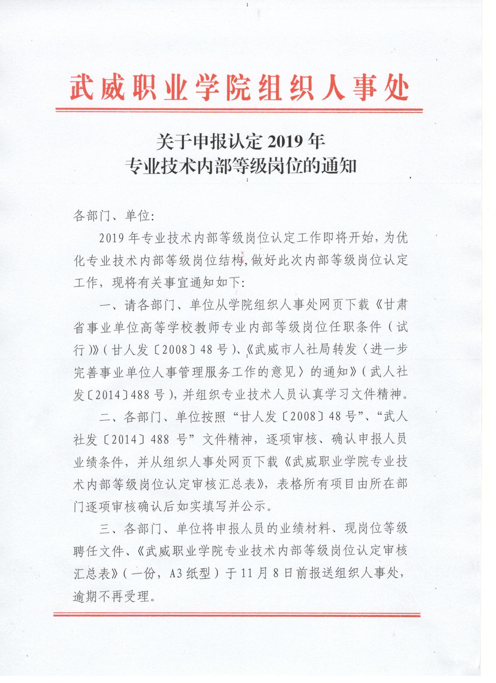 關(guān)于申報(bào)認(rèn)定2019年專業(yè)技術(shù)內(nèi)部等級(jí)崗位的通知
