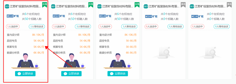 一是主動在“新入場求職者”標簽下,瀏覽入場求職人員簡歷,點擊“立即洽談”對意向洽談人員發(fā)出溝通申請,并進行面試洽談。如下圖: