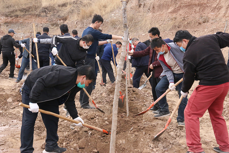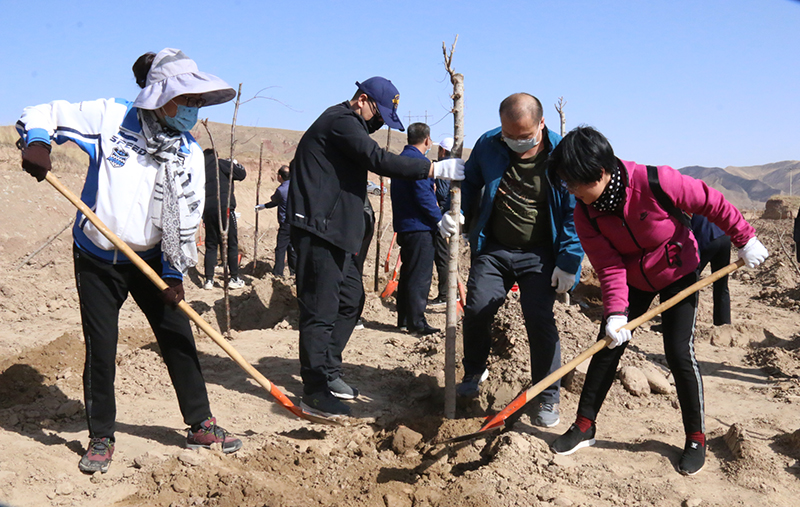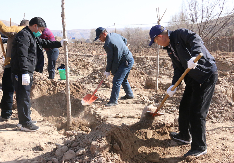 春風(fēng)吹拂處,新綠綻枝頭。為深入學(xué)習(xí)貫徹習(xí)近平總書記視察甘肅的重要講話和批示精神,認(rèn)真踐行綠水青山就是金山銀山的發(fā)展理念,實施綠色發(fā)展戰(zhàn)略,進(jìn)一步加強(qiáng)祁連山生態(tài)環(huán)境保護(hù)與治理,幫助幫扶鎮(zhèn)打贏脫貧攻堅戰(zhàn),實施鄉(xiāng)村振興戰(zhàn)略,4月9日,學(xué)院領(lǐng)導(dǎo)班子成員、幫扶干部、駐村干部及部分教職工70多人深入結(jié)對幫扶鎮(zhèn)——黑松驛鎮(zhèn)開展義務(wù)植樹活動,建設(shè)“生態(tài)示范林”。春光沐浴的祁連山腳下黑松驛鎮(zhèn),春意盎然,生機(jī)勃勃,正是植樹好時節(jié)。廣大教職工一下車就拿起鐵鍬到植樹現(xiàn)場,與黑松驛鎮(zhèn)政府部分干部一起投入植樹活動,按照“橫看直線側(cè)一線、三埋兩踩一提苗”的技術(shù)要求,三人一組,分工協(xié)作,有序配合,揮鍬培土、扶苖踩土、圍堰澆水,現(xiàn)場一派熱火朝天的勞動景象。當(dāng)天植樹育林約20余畝,一棵棵新栽的樹苗整齊排列,迎風(fēng)挺立。通過義務(wù)植樹,廣大教職工用實際行動傳播著生態(tài)文明、綠色發(fā)展理念,切實幫助幫扶鎮(zhèn)綠起來,美起來,富起來。