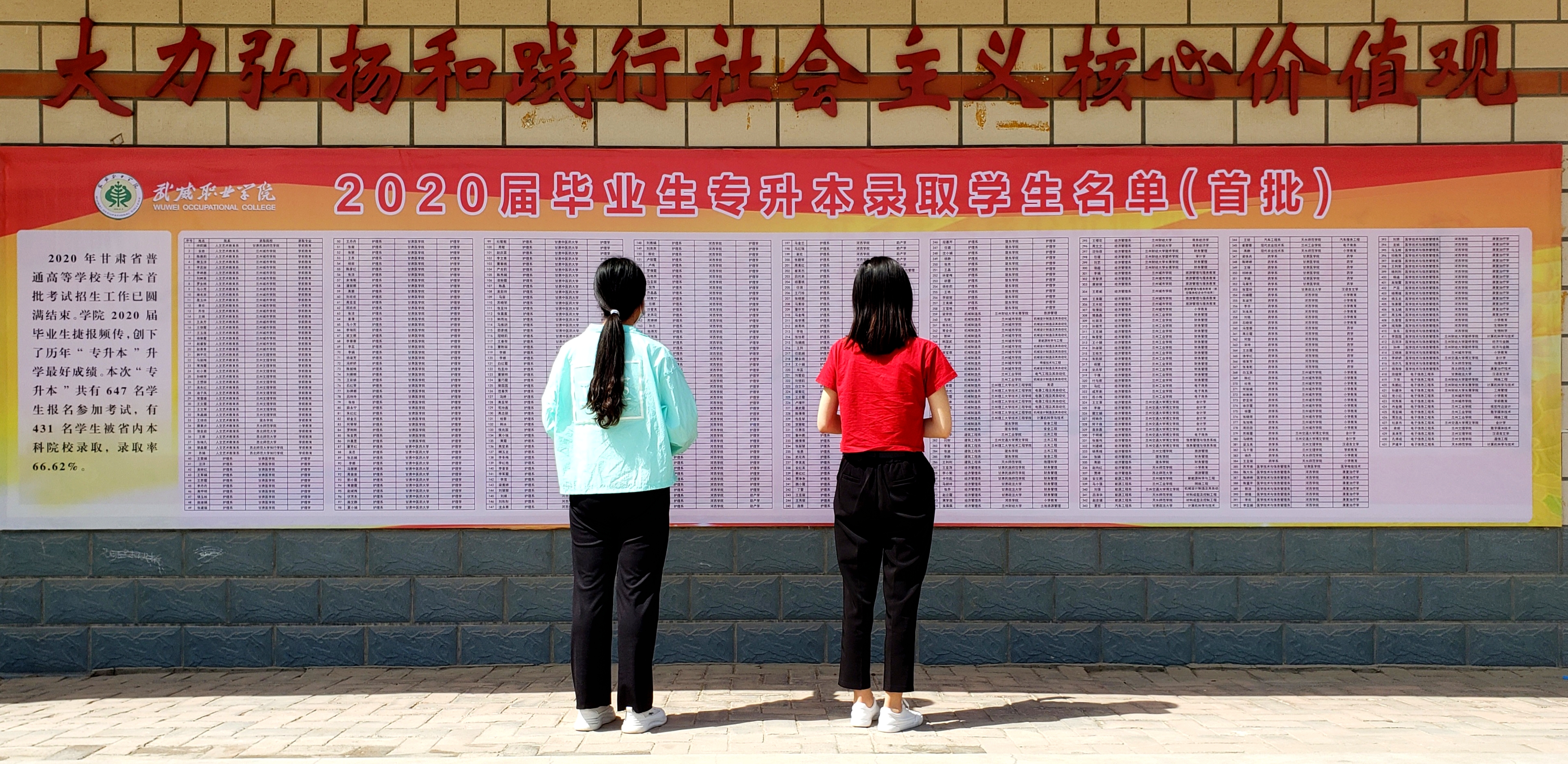 2020年甘肅省普通高等學校專升本首次考試招生工作已圓滿結束。學院2020屆畢業(yè)生捷報頻傳,創(chuàng)下了歷年“專升本”升學的最好成績。本次“專升本”共有647名學生報名參加考試,有431名學生被省內本科院校錄取,錄取率為66.62%。