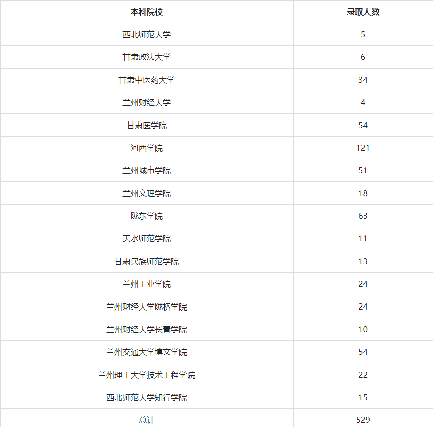 2020年甘肅省普通高等學(xué)校專升本第一批、第二批考試招生工作已圓滿結(jié)束。我院2020屆畢業(yè)生捷報(bào)頻傳,創(chuàng)下了歷年“專升本”升學(xué)的最好成績(jī)。726名學(xué)生報(bào)名參加考試,有529名學(xué)生被省內(nèi)本科院校錄取,錄取率為72.87%。