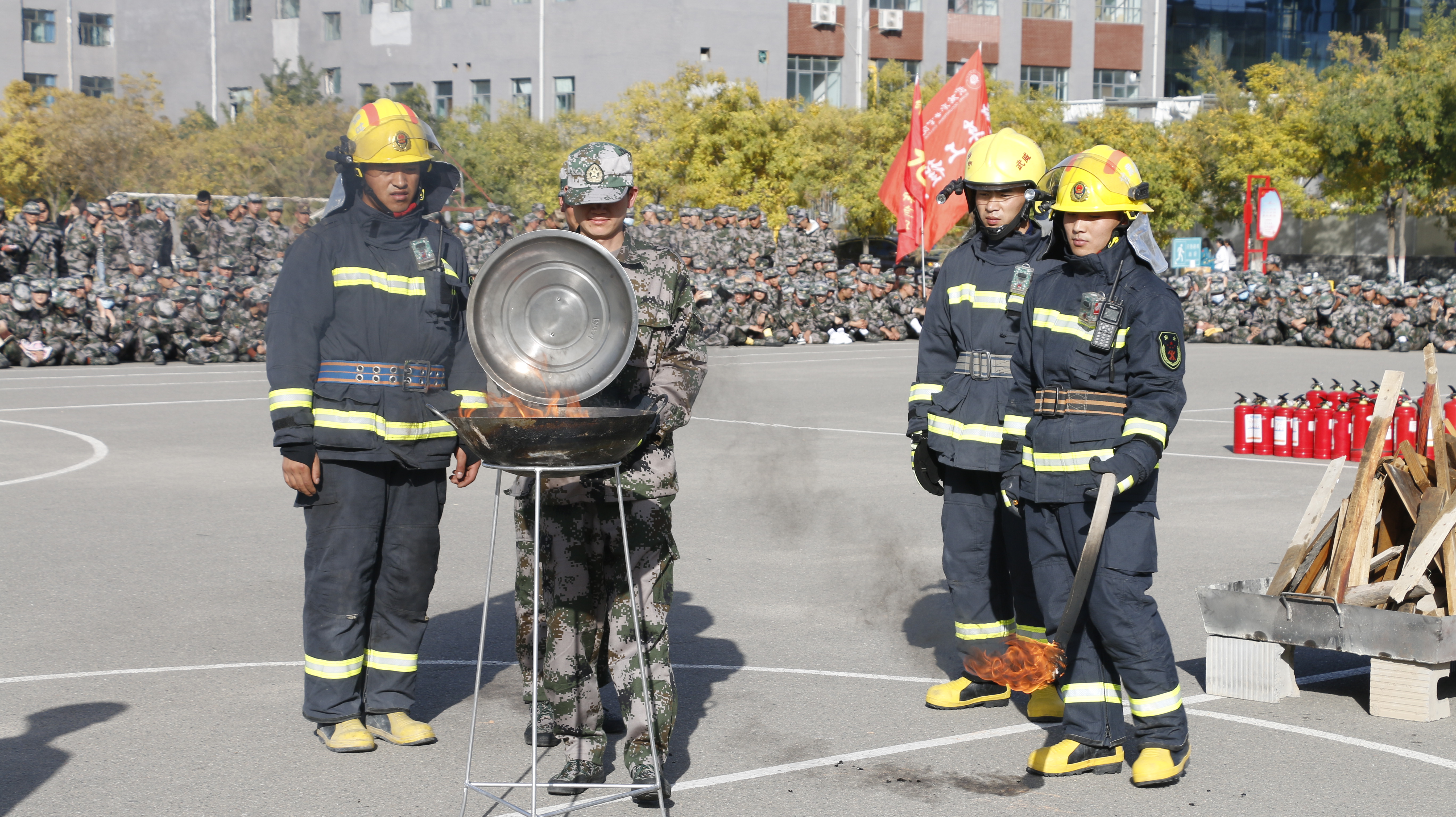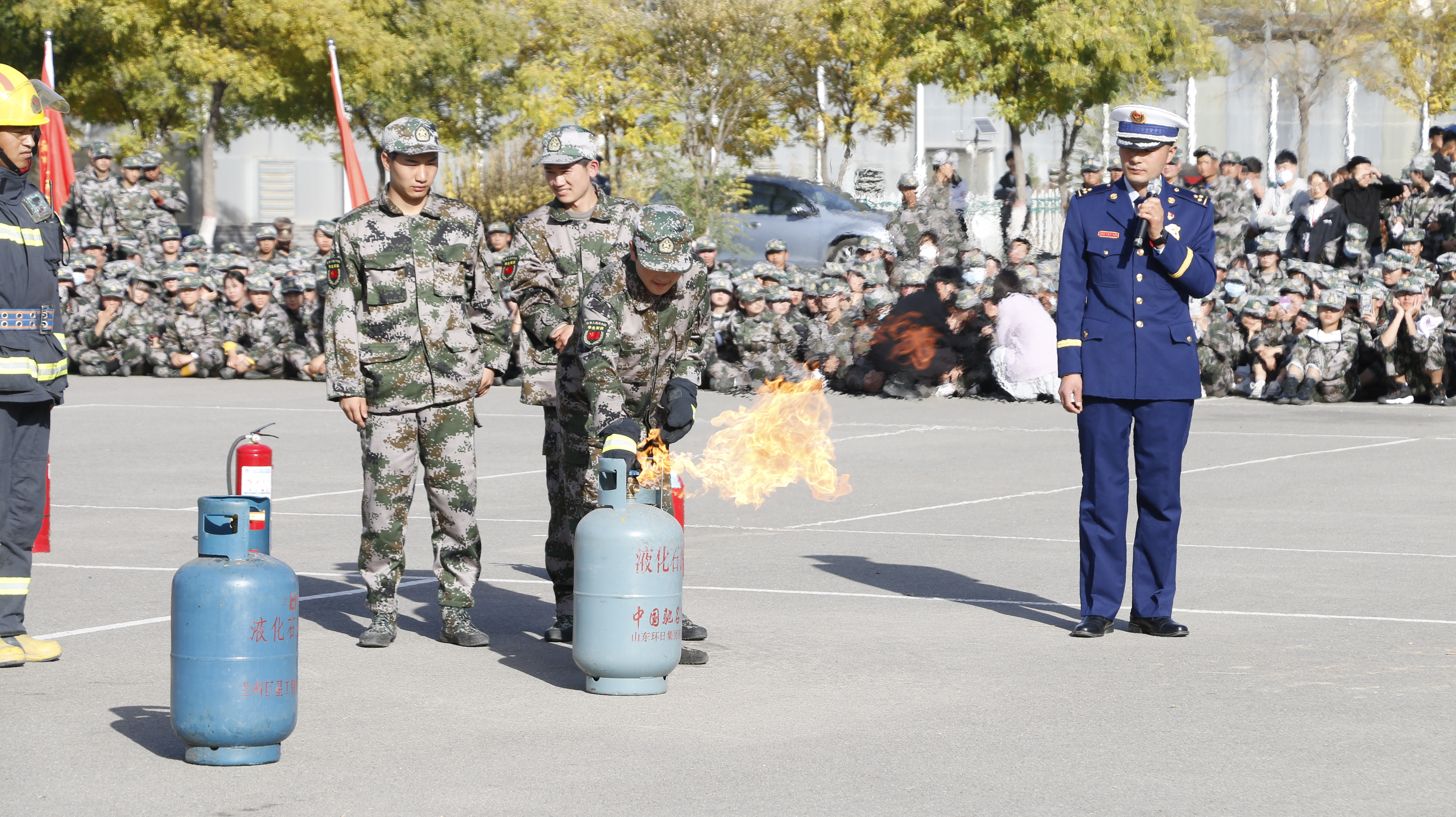 隨后,2020級全體新生整隊到操場參加了滅火演練。在消防救援中隊指戰(zhàn)員的講解和示范下,同學(xué)們學(xué)習(xí)了應(yīng)急逃生、火災(zāi)報警和滅火器使用等消防安全常識,學(xué)生代表體驗(yàn)了處置液化氣瓶滅火、油鍋滅火、干粉滅火器滅火等操作,在實(shí)戰(zhàn)中提高了消防應(yīng)急能力。