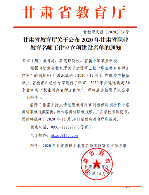 甘肅省教育廳關于公布 2020 年甘肅省職業(yè) 教育名師工作室立項建設名單的通知