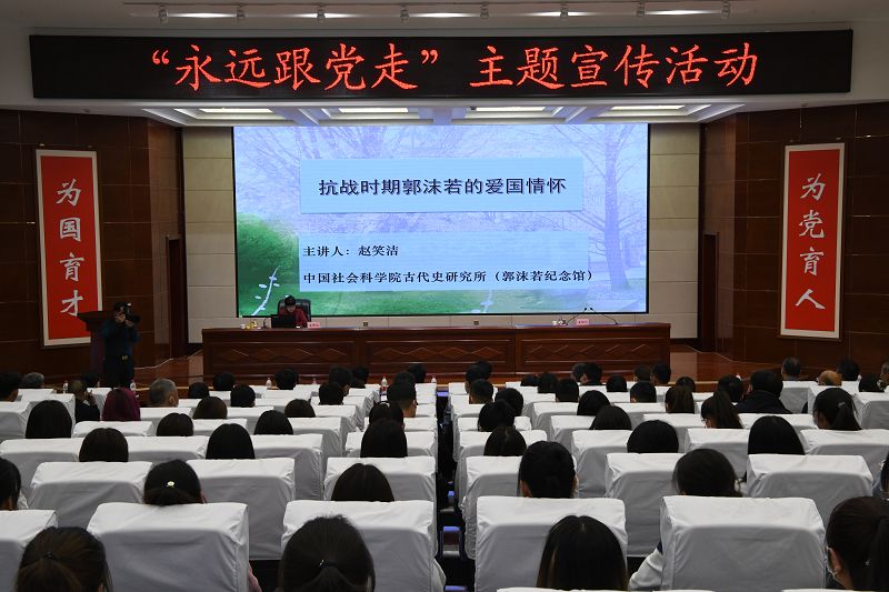 5月21日,中國(guó)社會(huì)科學(xué)院古代史研究所黨委書(shū)記、郭沫若紀(jì)念館原館長(zhǎng)趙笑潔來(lái)學(xué)院作《抗戰(zhàn)時(shí)期郭沫若的愛(ài)國(guó)情懷》專(zhuān)題講座,學(xué)院在家院領(lǐng)導(dǎo)、副科級(jí)以上干部、師生代表共計(jì)220人聆聽(tīng)了講座。