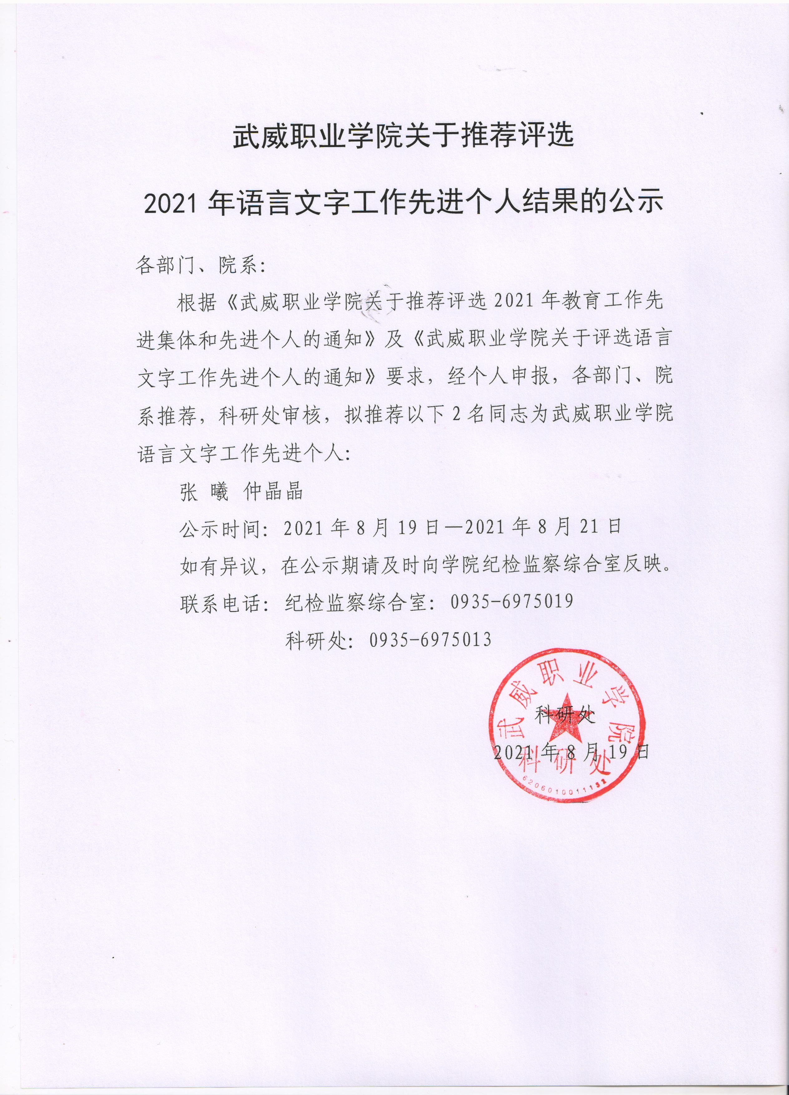 武威職業(yè)學(xué)院關(guān)于推薦評選2021年語言文字工作先進(jìn)個人結(jié)果的公示