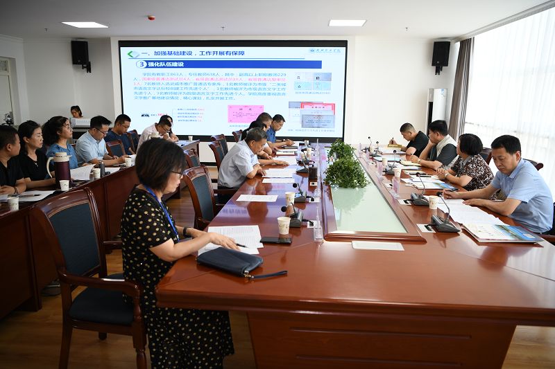 首先召開了“甘肅省語(yǔ)言文字推廣基地建設(shè)工作匯報(bào)會(huì)”,田迎春同志做了工作匯報(bào)。省語(yǔ)委專家聽取匯報(bào)、查看基地建設(shè)支撐資料,并就基地建設(shè)經(jīng)費(fèi)保障、推廣活動(dòng)的內(nèi)容及形式等方面提出問題,學(xué)院相關(guān)負(fù)責(zé)同志作出詳細(xì)解答。匯報(bào)、提問結(jié)束后,李晶同志對(duì)學(xué)院基地建設(shè)中取得的成績(jī)給予了肯定,同時(shí)也指出了建設(shè)過程中存在的問題與不足。他強(qiáng)調(diào)在以后的工作中要充分利用學(xué)院師資力量,結(jié)合武威當(dāng)?shù)靥厣?,不斷?chuàng)新語(yǔ)言文字推廣工作的形式和內(nèi)容,形成品牌特色,將推廣工作從學(xué)院推向全市,為武威經(jīng)濟(jì)社會(huì)發(fā)展做出更多貢獻(xiàn)。趙明同志代表學(xué)院向省語(yǔ)委專家表達(dá)了對(duì)我院基地建設(shè)工作指導(dǎo)的感謝,并表示在今后作中我院將發(fā)揮優(yōu)勢(shì),彌補(bǔ)不足,進(jìn)一步加強(qiáng)基地建設(shè),在學(xué)院語(yǔ)言文字工作方民面取得新突破,引領(lǐng)當(dāng)?shù)卣Z(yǔ)言文字事業(yè)發(fā)展。