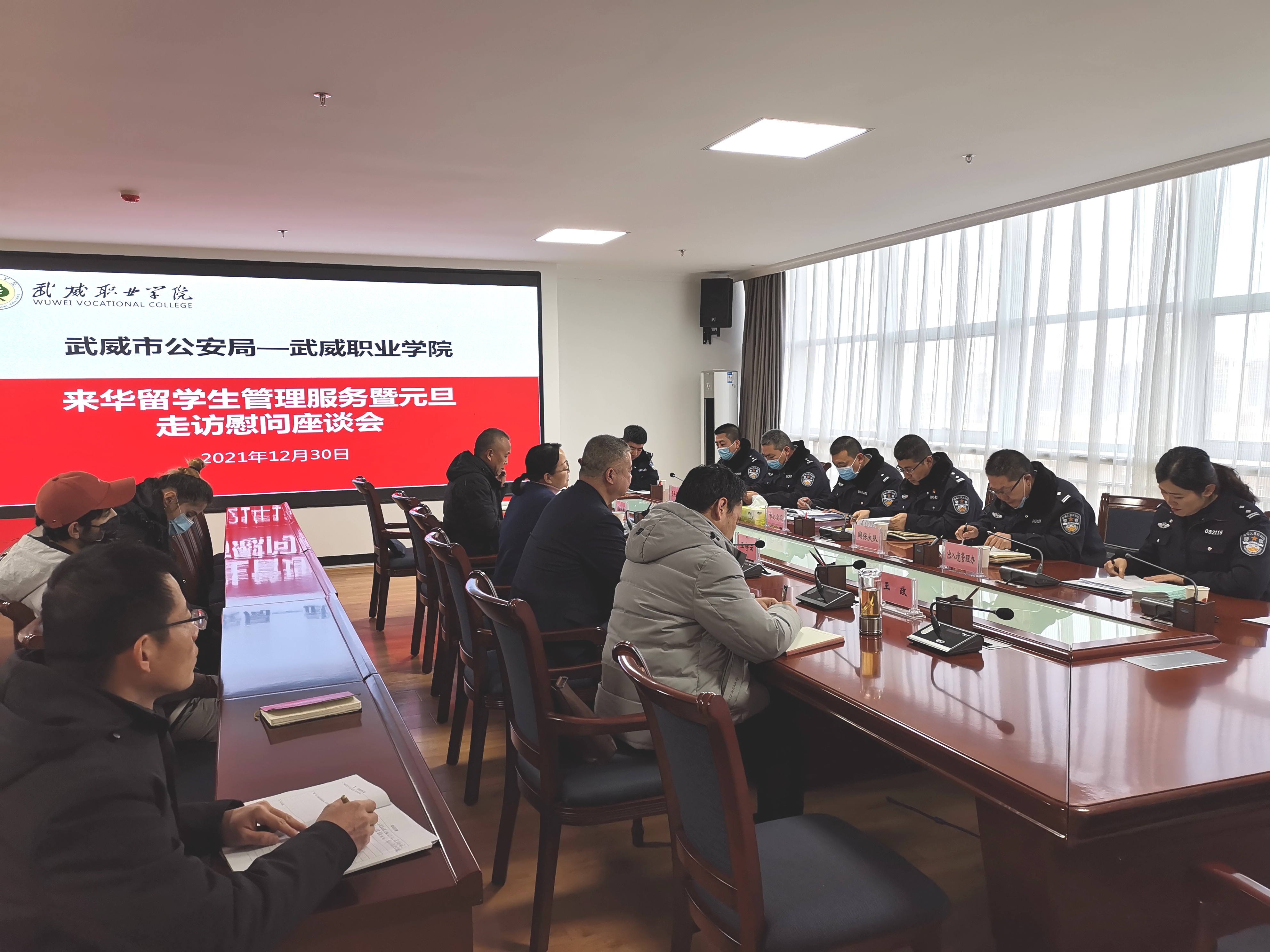 12月30日上午,市公安局出入境管理科、非政府組織管理辦公室,市公安局涼州分局國安大隊、反恐大隊、出入境管理辦公室、涼州分局西關街派出所一行十一人到訪學院,開展來華留學生管理服務暨元旦走訪慰問活動。黨委委員、副院長田迎春、王守云出席活動。國際合作與交流處處長潘從民、保衛(wèi)處處長王政及相關人員,2019級、2021級在華留學生參加活動。田迎春主持活動。