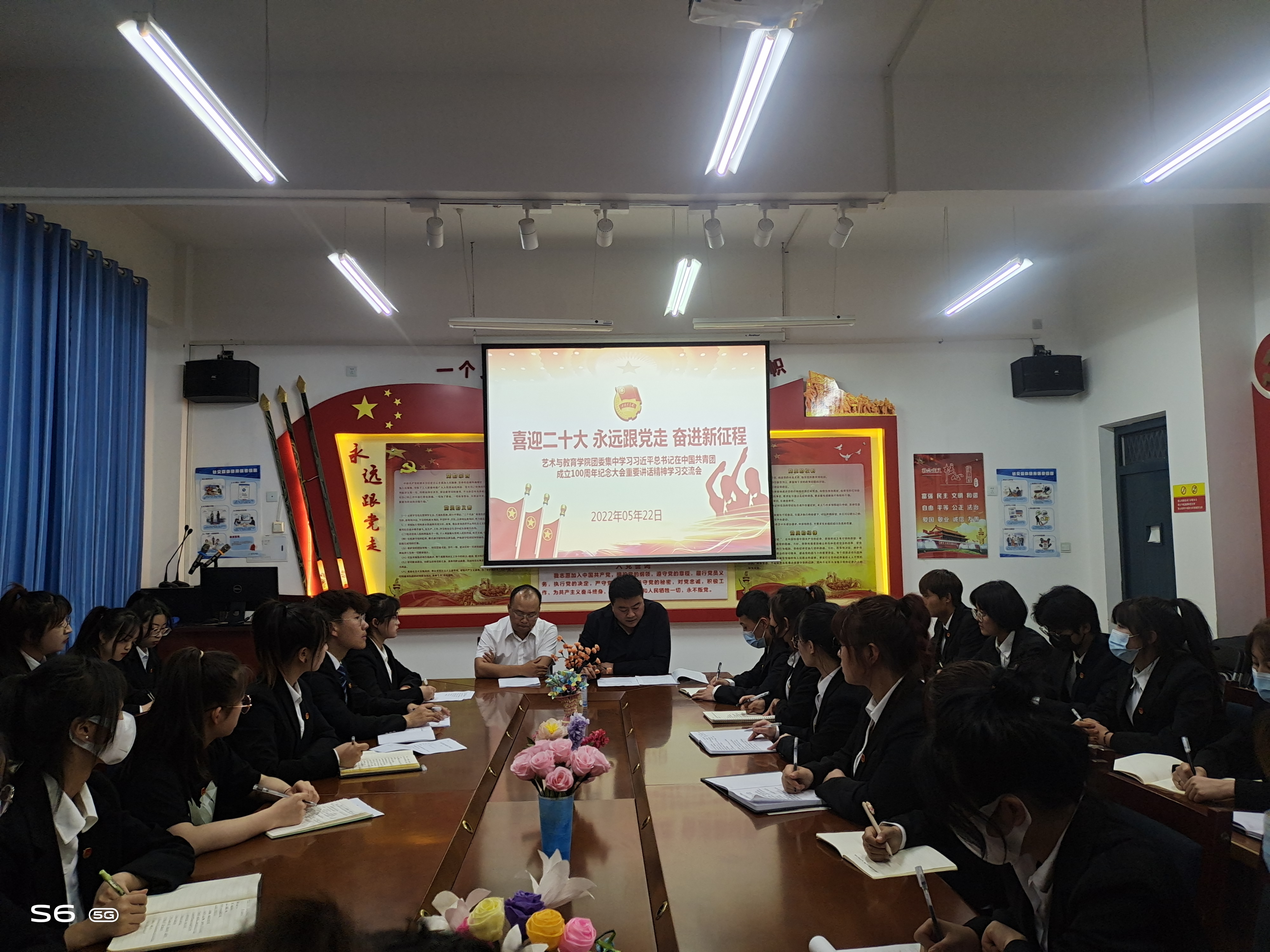 2022年5月22日晚,藝術(shù)與教育學(xué)院團(tuán)委以“喜迎二十大,奮進(jìn)新征程,永遠(yuǎn)跟黨走”為主題,開展習(xí)近平總書記在慶祝中國共產(chǎn)主義青年團(tuán)成立100周年大會(huì)上的重要講話精神學(xué)習(xí)研討交流會(huì),參會(huì)人員由藝術(shù)與教育學(xué)院副院長李欣,團(tuán)委書記唐鑫基,20、21級(jí)各班團(tuán)支部書記及優(yōu)秀團(tuán)員代表、預(yù)備黨員、入黨積極分子和入團(tuán)積極分子代表組成。
