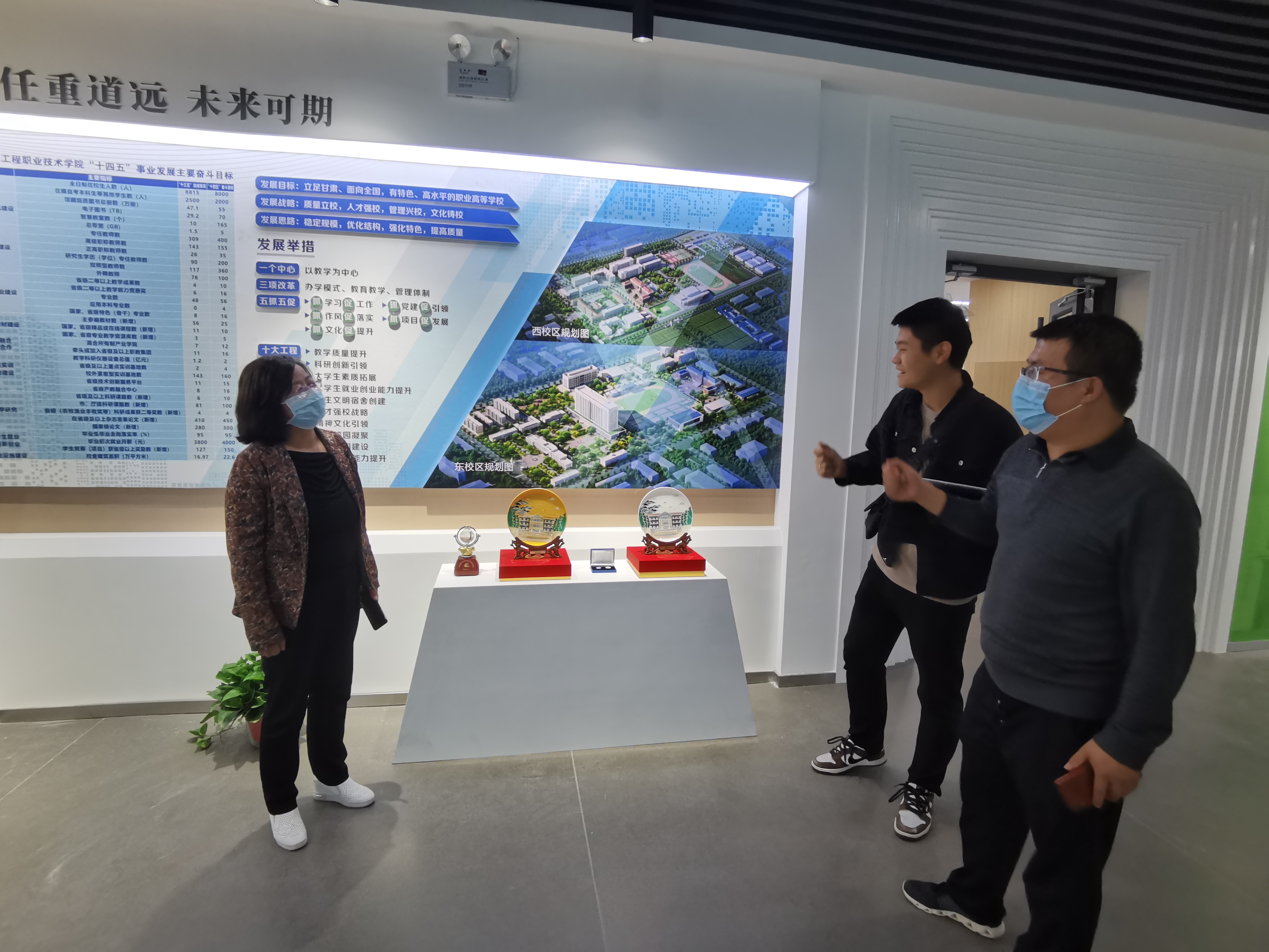 為全面推進(jìn)“雙高計(jì)劃”學(xué)校建設(shè),提升圖書館服務(wù)水平,營造“書香校園”,將圖書館打造成人性化、智能化、專業(yè)化的綠色學(xué)習(xí)空間。近日,圖書館館長楊如松、副館長蔡濟(jì)眾、館員楊建盛三人到甘肅省畜牧工程職業(yè)技術(shù)學(xué)院圖書館考察學(xué)習(xí),在甘肅省畜牧工程職業(yè)技術(shù)學(xué)院圖書館館長解玉寶陪同下,參觀了該校圖書館讀書吧、校史館、黨史館、“挑戰(zhàn)杯”獲獎作品展覽館等處,解玉寶講解了該館設(shè)計(jì)理念及建設(shè)過程中的側(cè)重點(diǎn)和展示重點(diǎn)。楊如松就現(xiàn)在圖書館裝發(fā)展趨勢、圖書館管理辦法、學(xué)生借閱量等實(shí)際問題同解玉寶進(jìn)行了相互交流。
