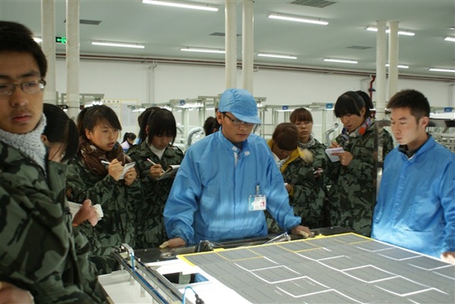 在校外實(shí)訓(xùn)過(guò)程中,由工藝部楊經(jīng)理和工藝部文工程師給大家介紹公司情況、公司管理規(guī)范,并帶領(lǐng)大家進(jìn)行參觀,給學(xué)生詳細(xì)講解整個(gè)光伏產(chǎn)業(yè)鏈,包括硅片的生產(chǎn)、電池片的生產(chǎn)和太陽(yáng)能電池組件的生產(chǎn),重點(diǎn)是光伏組件的生產(chǎn)。實(shí)訓(xùn)期間由工廠師傅帶領(lǐng)學(xué)生在車間分組進(jìn)行實(shí)訓(xùn)。依據(jù)光伏組件生產(chǎn)工作流程實(shí)訓(xùn)內(nèi)容分為前道工序和后道工序,前道工序包括:電池片篩選、單焊、串焊、疊層、初檢、EL1測(cè)試和層壓;后道工序包括:削邊、裝邊框、裝接線盒、清洗、EL2測(cè)試、功率測(cè)試、終檢和包裝入庫(kù)。同學(xué)們通過(guò)親身體驗(yàn)和輪崗學(xué)習(xí),熟悉了光伏組件的每一道生產(chǎn)工序,對(duì)光伏組件的整個(gè)生產(chǎn)過(guò)程有了一個(gè)更加清晰的認(rèn)識(shí)和了解。