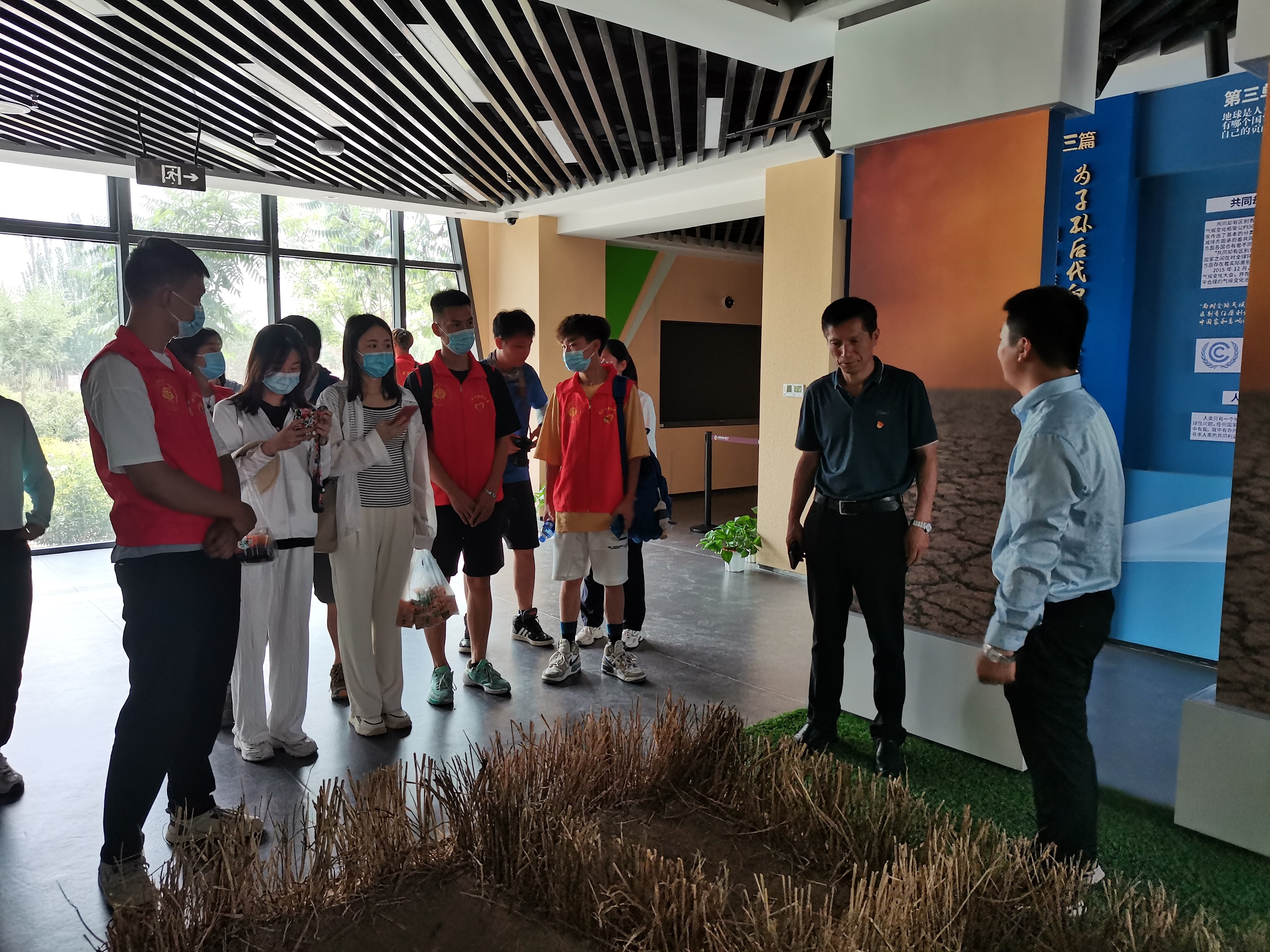 在八步沙兩山實(shí)踐基地展覽館內(nèi),實(shí)踐團(tuán)成員與來八步沙兩山實(shí)踐基地參觀學(xué)習(xí)的常州紡織職業(yè)技術(shù)學(xué)院老師共同聆聽了工作人員的講解,通過工作人員的講解,我們了解到:“在上世紀(jì)六七十年代八步沙周邊受風(fēng)沙影響較大,生態(tài)環(huán)境十分惡劣,所以,也就有了“一夜北風(fēng)沙騎墻,早上起來綠上房”的說法,為了保護(hù)家園,六老漢他們拿起鐵鍬開始一樹一坑一桶水的傳統(tǒng)治沙,組建八步沙集體林場(chǎng),經(jīng)過反復(fù)摸索,在艱苦惡劣的環(huán)境中開啟了艱辛治理征程,實(shí)現(xiàn)了從“沙進(jìn)人退”到“人進(jìn)沙退”的歷史性轉(zhuǎn)變,六老漢不享兒孫繞膝福、甘守大漠獻(xiàn)余生的事跡也被得到了廣為流傳。
