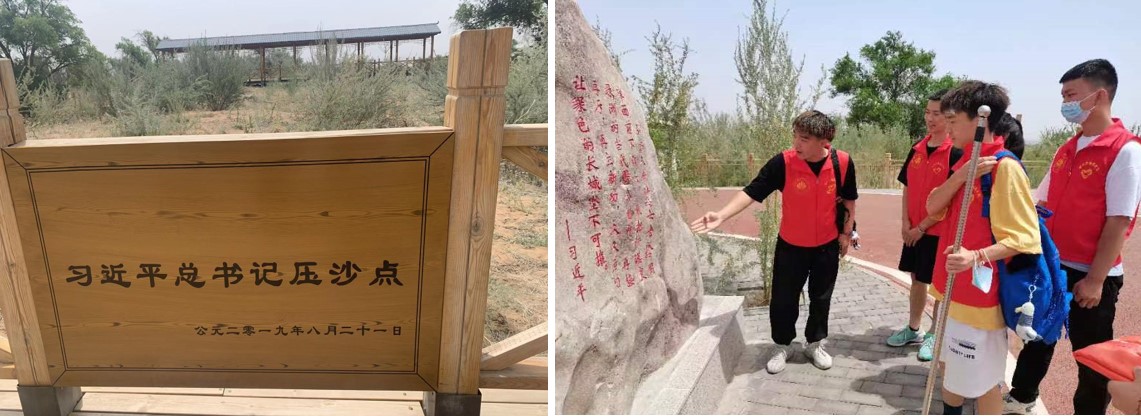 在兩山實(shí)踐基地負(fù)責(zé)人的指引下,我們參觀了習(xí)近平總書記曾經(jīng)到達(dá)過八步沙參與壓沙的目的地,認(rèn)真學(xué)習(xí)了習(xí)近平總書記在八步沙的講話精神,深刻領(lǐng)悟到了習(xí)近平總書記號(hào)召大家要弘揚(yáng)八步沙“六老漢”困難面前不低頭,敢把沙漠變綠洲的當(dāng)代愚公精神,在今后,我們將把這種精融入到實(shí)踐當(dāng)中,不負(fù)青春,不負(fù)韶華積極投身于祖國(guó)建設(shè)中。