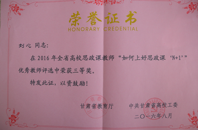根據(jù)《甘肅省教育廳 中共甘肅省高校工委關(guān)于開展“如何上好思政課‘N+1’”優(yōu)秀教師評選活動(dòng)的通知》要求,我系劉心教師積極參加,最終喜獲由甘肅省教育廳 中共甘肅省高校工委頒發(fā)的在2016年全省高校思政課教師“如何上好思政課‘N+1’”優(yōu)秀教師評選中榮獲三等獎(jiǎng)。