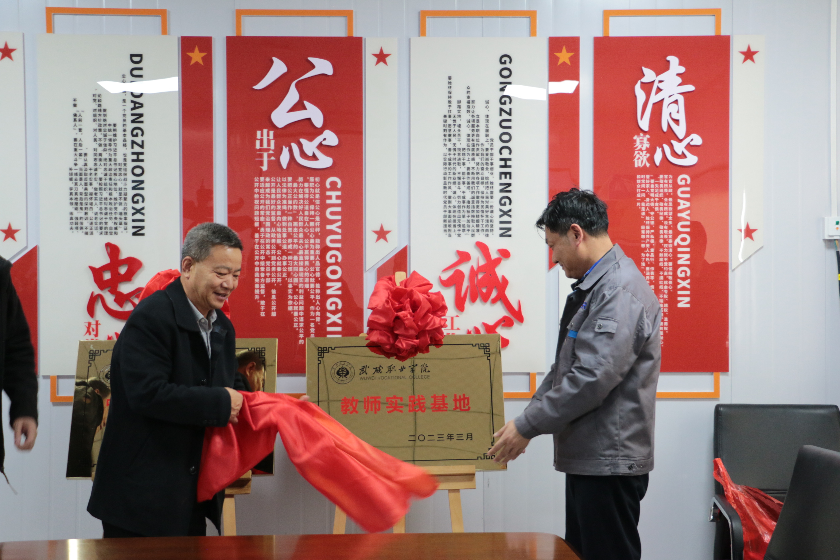 戴志敏和趙明為武威職業(yè)學(xué)院在應(yīng)物所武威園區(qū)的教師實踐基地和實訓(xùn)基地揭牌。