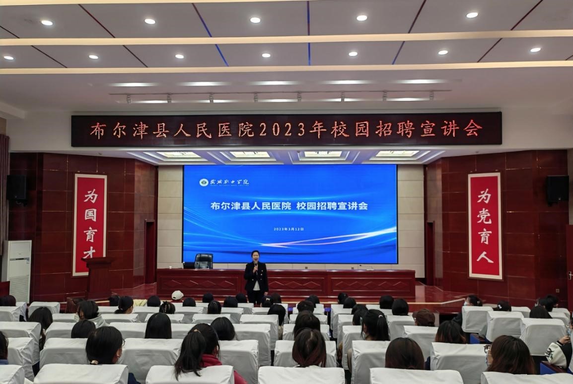 3月12日簽約儀式結(jié)束后,布爾津縣人民醫(yī)院黨委書記李娟在學(xué)生發(fā)展中心舉行了校園招聘宣講活動,護(hù)理學(xué)院約200名師生參加,部分學(xué)生現(xiàn)場達(dá)成實習(xí)就業(yè)意向。