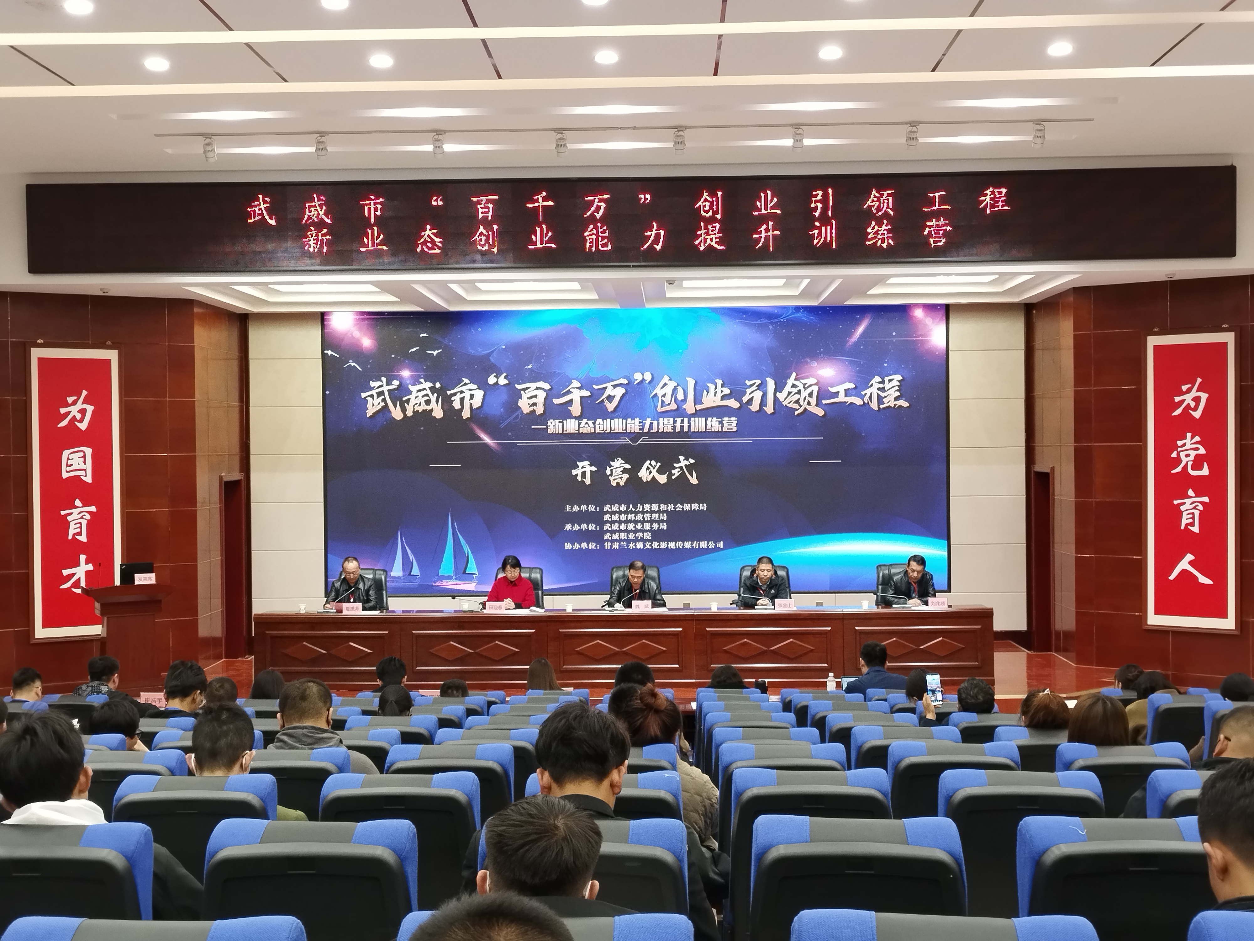 4月6日上午,由我校協(xié)辦的武威市“百千萬”創(chuàng)業(yè)引領(lǐng)工程新業(yè)態(tài)創(chuàng)業(yè)能力提升訓練營在菁英廳舉辦開營儀式,武威市人社局黨組成員、就業(yè)局局長魏斌,武威市郵政管理局黨組成員、副局長張金山,武威市就業(yè)局副局長劉兆順及副校長田迎春出席開營儀式,儀式由市就業(yè)局副局長夏湧濤主持。