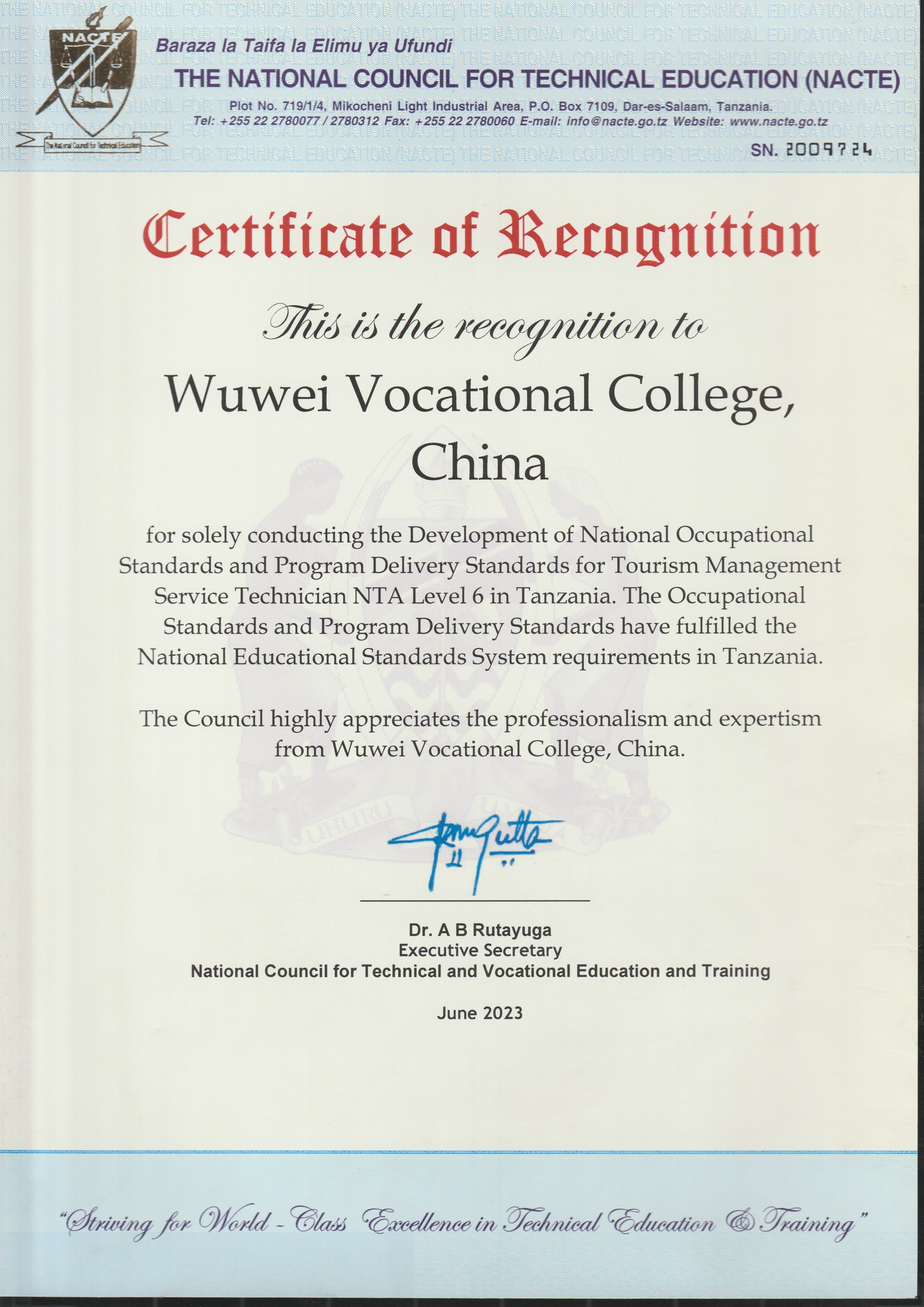 6月16日,學(xué)校獨(dú)立開發(fā)制定的旅游管理服務(wù)技術(shù)員6級(jí)職業(yè)標(biāo)準(zhǔn)和配套專業(yè)教學(xué)標(biāo)準(zhǔn)通過了坦桑尼亞國(guó)家職業(yè)教育委員會(huì)審核,獲得認(rèn)證,正式納入坦桑尼亞國(guó)家職業(yè)教育體系。旅游管理服務(wù)技術(shù)員6級(jí)職業(yè)標(biāo)準(zhǔn)和配套專業(yè)教學(xué)標(biāo)準(zhǔn)由學(xué)校經(jīng)濟(jì)管理學(xué)院旅游管理專業(yè)教師許春華、占發(fā)禹、張語(yǔ)悅、王美婕、閆亞旗、劉金萍六位教師共同開發(fā)制定。