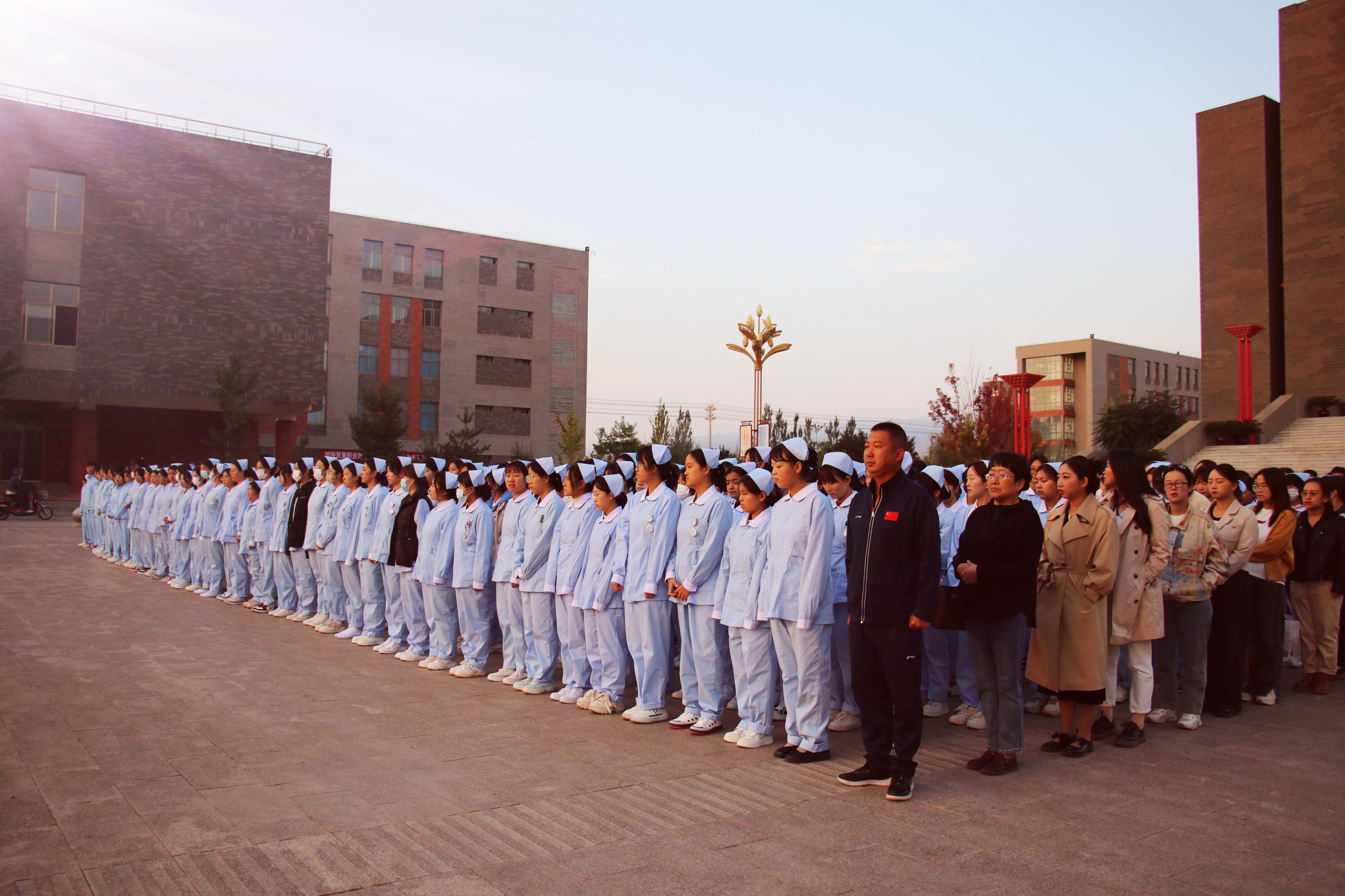 10月9日清晨,護(hù)理學(xué)院在圖書館前廣場舉行升國旗儀式,學(xué)院黨總支書記張建輝、團(tuán)委書記楊杰、全體班主任及2022、2023級(jí)全體學(xué)生參加此次升旗儀式,儀式由楊杰主持。
