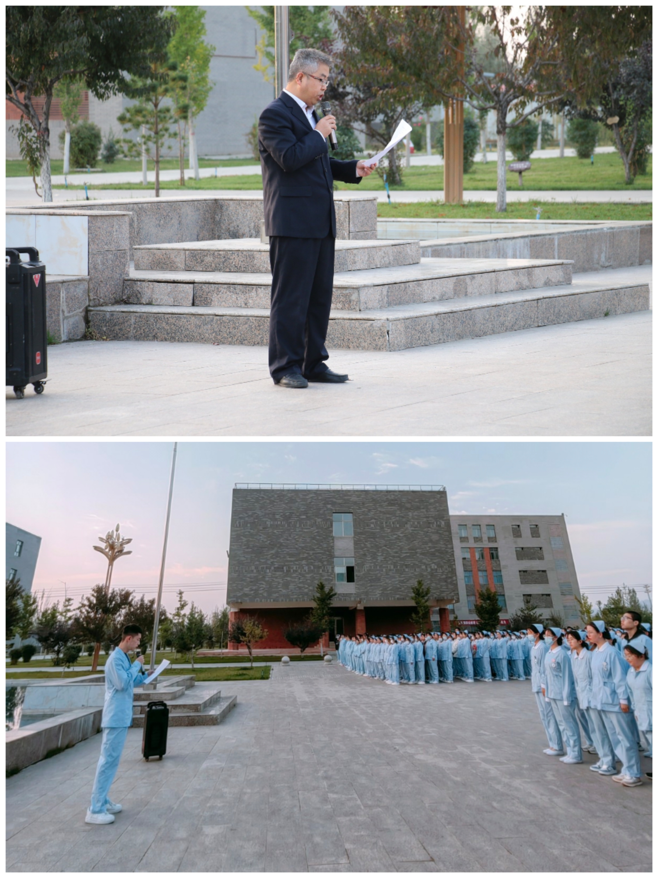 10月9日清晨,護(hù)理學(xué)院在圖書館前廣場(chǎng)舉行升國旗儀式,學(xué)院黨總支書記張建輝、團(tuán)委書記楊杰、全體班主任及2022、2023級(jí)全體學(xué)生參加此次升旗儀式,儀式由楊杰主持。