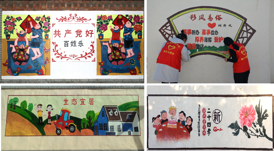 自2019 年以來,武威職業(yè)學院堅持“立足地方、融入地方、服務(wù)地方”的發(fā)展理念,將優(yōu)勢學科專業(yè)與武威市經(jīng)濟社會發(fā)展緊密結(jié)合,組織師生開展“打造人文美居助力鄉(xiāng)村振興”墻體彩繪志愿服務(wù)項目,通過墻體彩繪反映黨的領(lǐng)導下農(nóng)村精神風貌的變化和取得的成就,將村莊重點街巷屋面墻體繪制出一幅幅反映美麗鄉(xiāng)村建設(shè)、社會主義核心價值觀、移風易俗、鄉(xiāng)風文明等為主題的墻體畫,形象生動、 通俗易懂的內(nèi)容讓村民變“被動學”為“主動看”,不僅展現(xiàn)了農(nóng)村新生活、農(nóng)業(yè)新氣象、農(nóng)民新面貌,美化了村容村貌,為美麗鄉(xiāng)村建設(shè)、人居環(huán)境美化添磚加瓦。