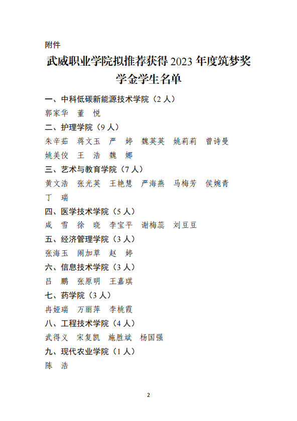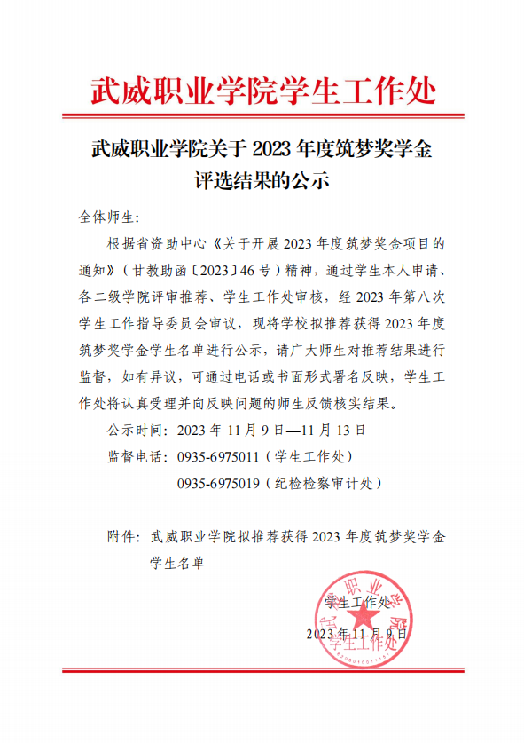 武威職業(yè)學(xué)院關(guān)于2023年度筑夢獎學(xué)金評選結(jié)果的…