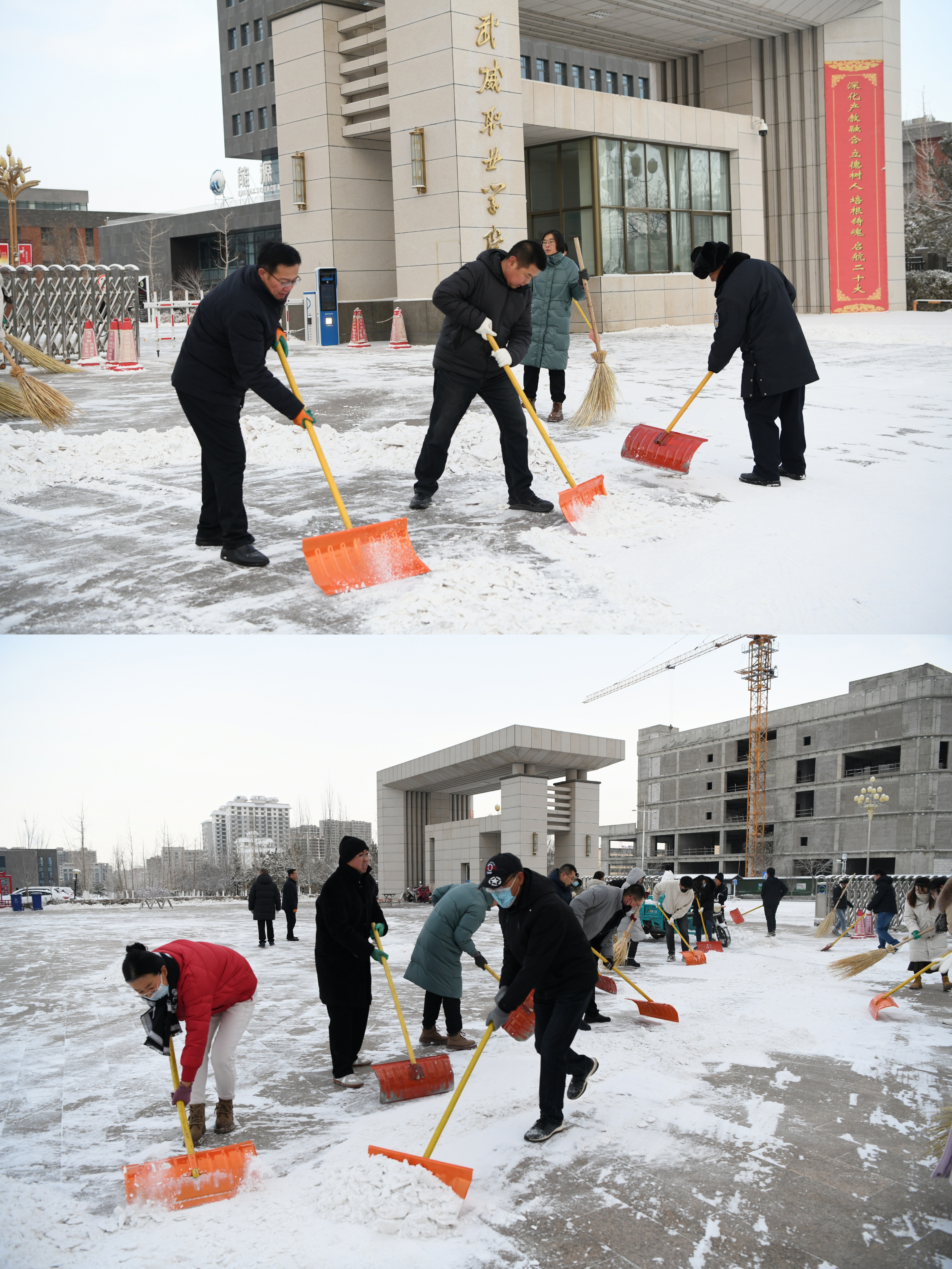 在校長、黨委副書記張開禮的帶領下,老師們都積極行動起來,拿上鐵鍬、掃帚清掃校內積雪。天氣雖然寒冷,但是大家的熱情卻溫暖了校園的每一個角落。老師們分工有序、干勁十足,不停的揮舞著手中的掃雪工具,積雪很快就被打掃干凈,消除了安全隱患。