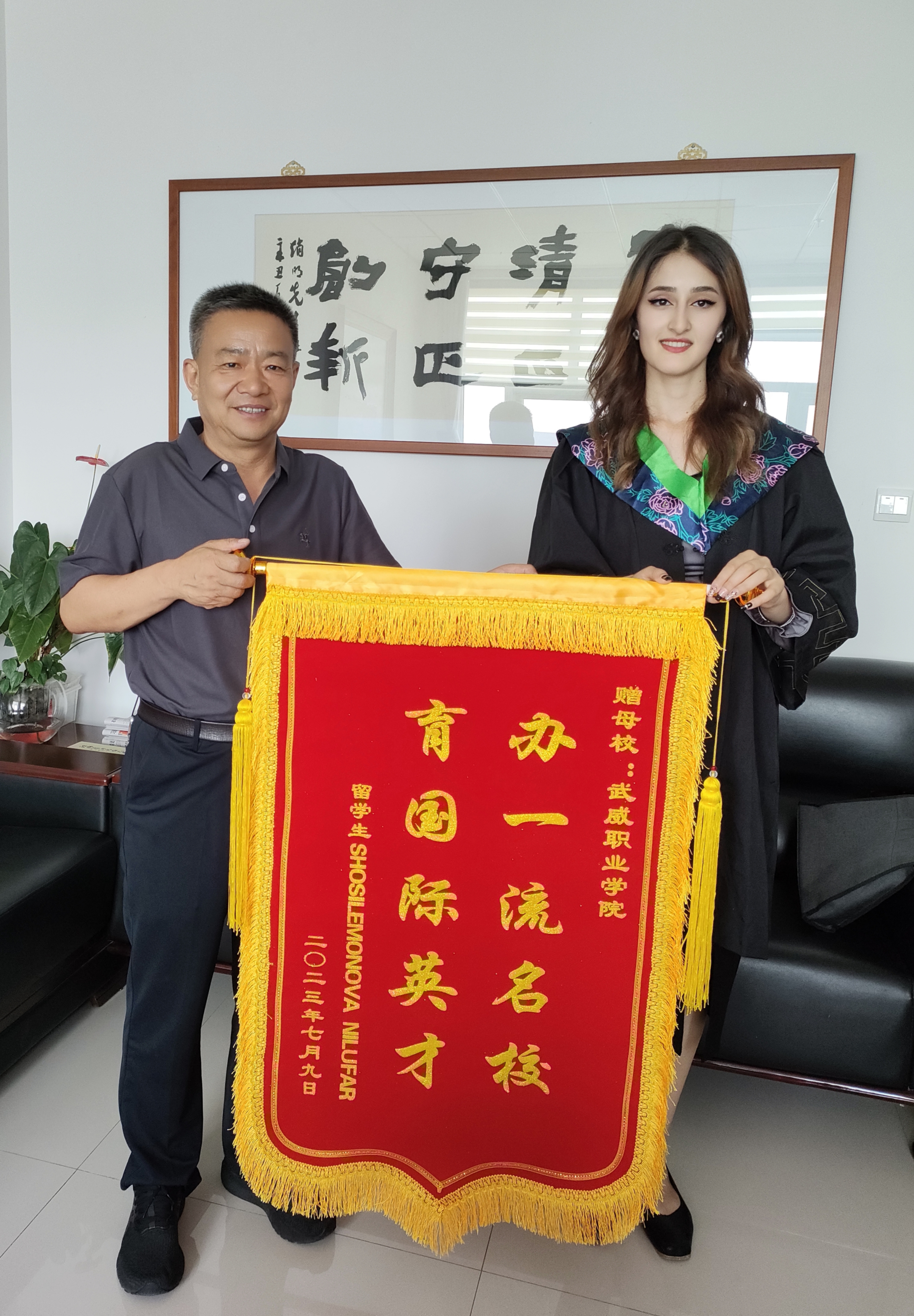 國際學(xué)生HOSILEMONOVA NILUFAR(妮娜)向?qū)W校贈送“辦一流名校 育國際英才”的感謝旌旗,對學(xué)校精心、悉心培養(yǎng)自己表達(dá)了由衷的感謝,表示在武威職業(yè)學(xué)院收獲了專業(yè)技能和人生閱歷,接觸到了先進(jìn)技術(shù)技能和前沿思想,特別是通過學(xué)習(xí)中國文化,深刻認(rèn)識到文化交流的重要性,也更加堅(jiān)定了自己繼續(xù)學(xué)習(xí)中文和中國文化的決心。