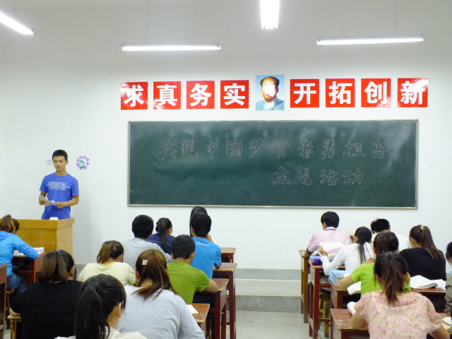 2013年5月20日,藥學(xué)系組織全體班團(tuán)干部在4號(hào)教學(xué)樓410教室開(kāi)展了“實(shí)現(xiàn)中國(guó)夢(mèng),青春勇?lián)?dāng)”的主題班團(tuán)干部會(huì)活動(dòng),同學(xué)們認(rèn)真聆聽(tīng)了習(xí)近平在同各界優(yōu)秀青年代表座談時(shí)的講話,習(xí)近平強(qiáng)調(diào),青年最富有朝氣,最富有夢(mèng)想,青年興則國(guó)興,青年強(qiáng)則國(guó)強(qiáng)。