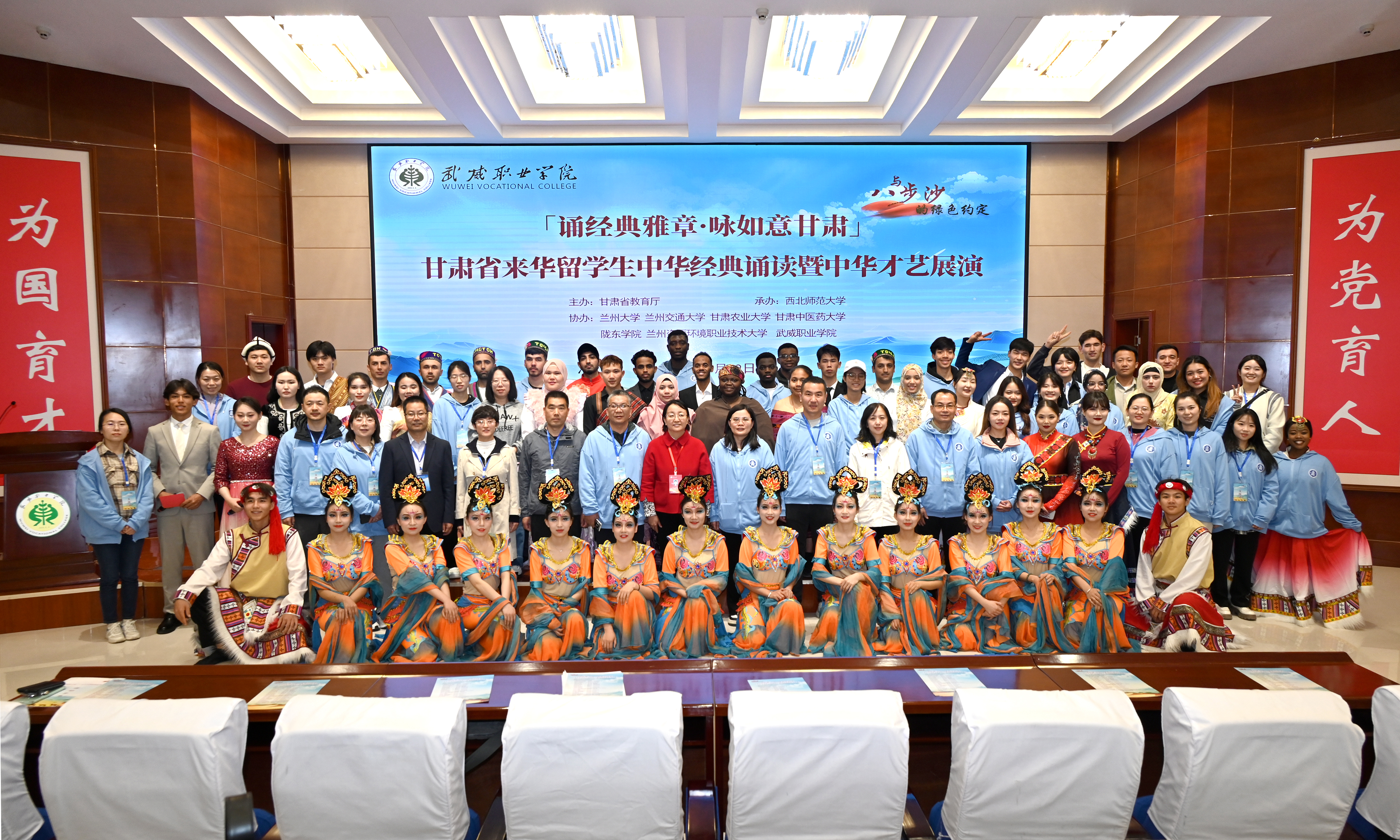 4月29日,省教育廳主辦、西北師范大學(xué)承辦的2024年甘肅省來華留學(xué)生“誦經(jīng)典雅章·詠如意甘肅”中華詩文誦讀展演活動(dòng)在學(xué)校舉行。展演活動(dòng)是2024年甘肅省高校留學(xué)生“感知中國-與八步沙的綠色約定”中華傳統(tǒng)文化體驗(yàn)活動(dòng)的分項(xiàng)活動(dòng)之一。蘭州大學(xué)、蘭州交通大學(xué)、西北師范大學(xué)、甘肅農(nóng)業(yè)大學(xué)、甘肅中醫(yī)藥大學(xué)、隴東學(xué)院、蘭州資源環(huán)境職業(yè)技術(shù)大學(xué)、武威職業(yè)學(xué)院8所高校的來自東帝汶、萊索托、蒙古、泰國、烏茲別克斯坦、加納等16個(gè)國家的50多名留學(xué)生參加展演。黨委委員、副校長田迎春出席活動(dòng)并致辭。