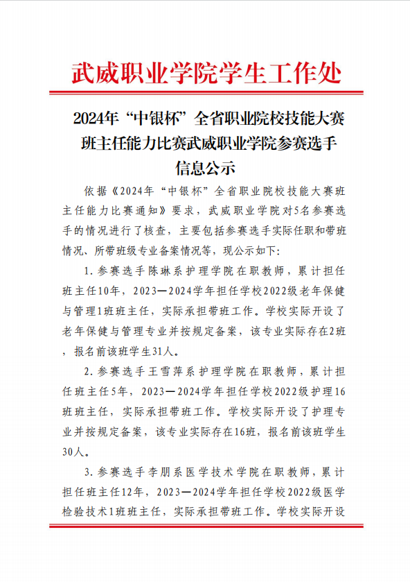 2024年“中銀杯”全省職業(yè)院校技能大賽班主任能力比賽武威職業(yè)學(xué)院參賽選手信息公示